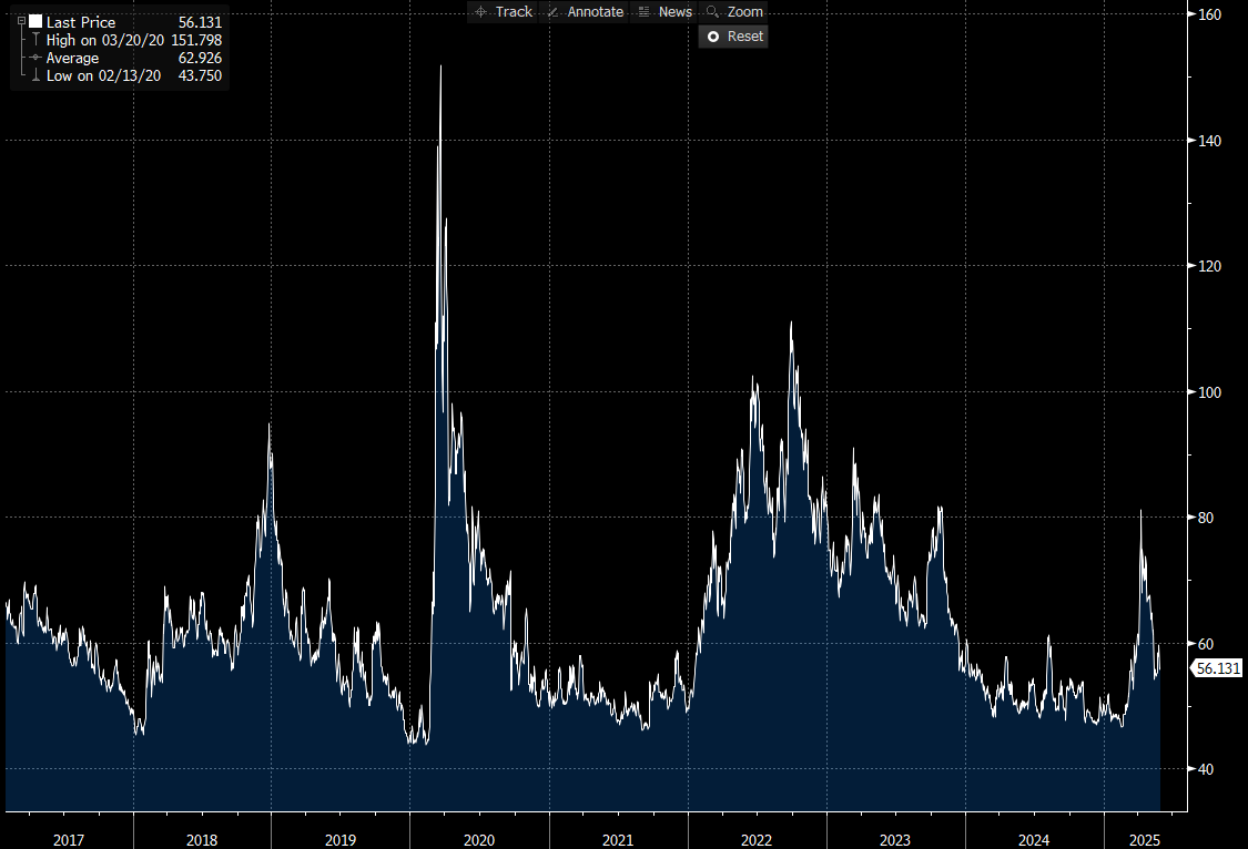 Current Spread: 56.1 bp (▲ ~0.4 bp d/d), indicating slight widening. Spreads remain below the 5-year historical average (~62.9 bp), influenced by ongoing macroeconomic and regulatory uncertainties.