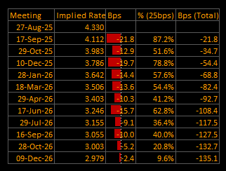September OIS Cut Probability: 87.2% — Implied Rate 4.112% | Implied Move –21.8 bp (~0.87×25)