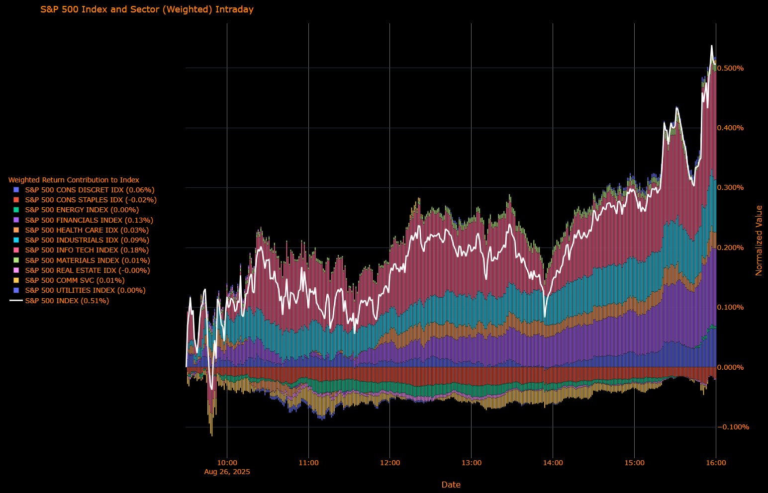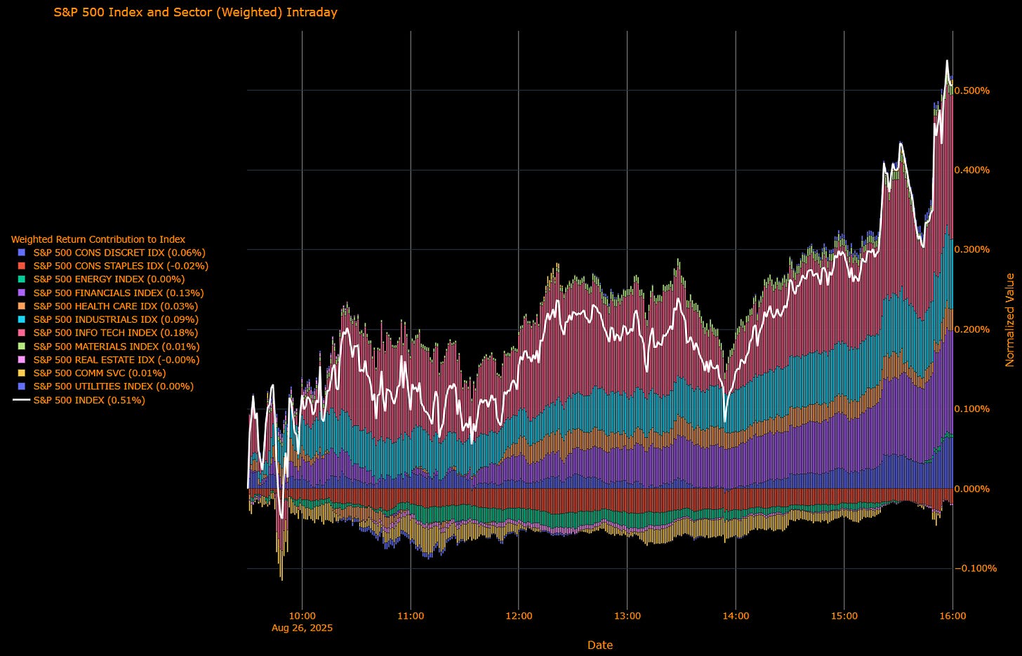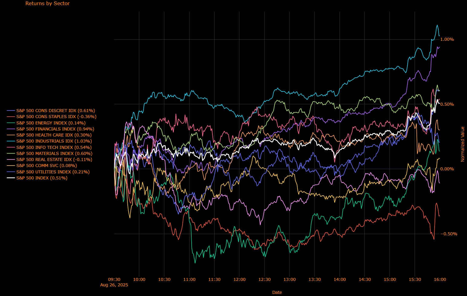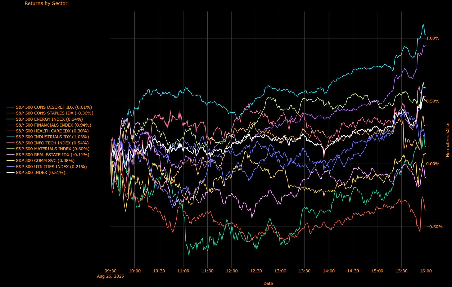 Laggards:Utilities (+0.21%), Energy (+0.14%), Communication Services (+0.08%), Real Estate (−0.11%), Consumer Staples (−0.36%).