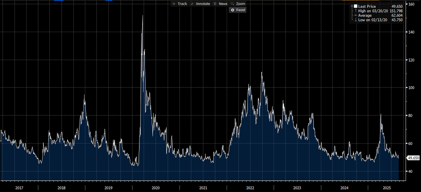 IG OAS: 49.65 bp • 5-yr avg: 62.60 bp (~13 bp inside) • Cycle low: 43.75 bp (~5.9 bp off tights) • COVID high: 151.80 bp (~102 bp tighter)