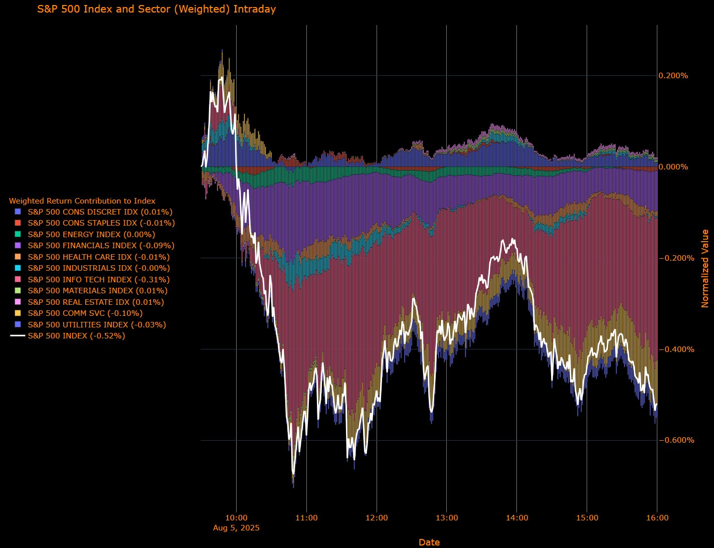 The S&P 500 fell another 0.52% on Tuesday, extending its recent slide as macro cracks widened and market leadership faltered. Beneath the surface, the story was clear: Tech, Utilities, and Comm Services led the decline, while cyclicals showed scattered resilience.