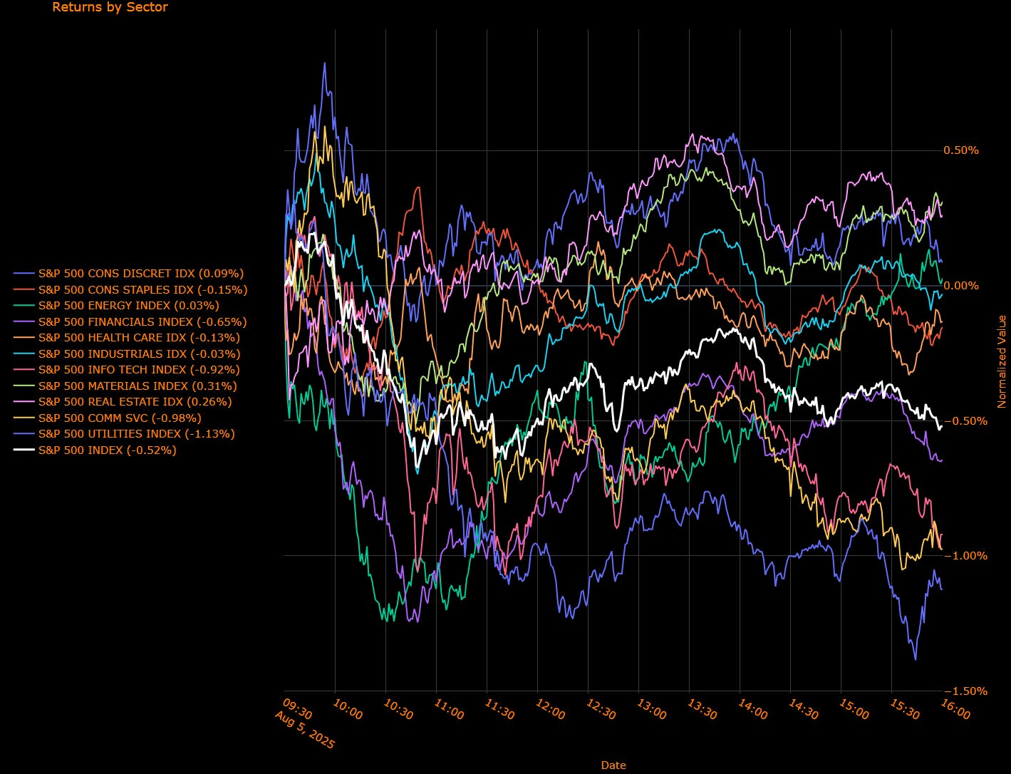 Staples (–0.15%), Industrials (–0.03%), Health Care (–0.13%), Energy (+0.03%) – All posted muted or modest losses.