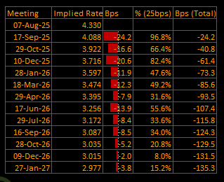 The September rate cut is now nearly a lock, with 96.8% probability priced and a full 34.2 bp of easing implied for the meeting. But the market’s longer-term outlook subtly shifted: the terminal rate edged higher to 2.977%, and cumulative cuts through January 2027 expanded modestly to –135.5 bp.