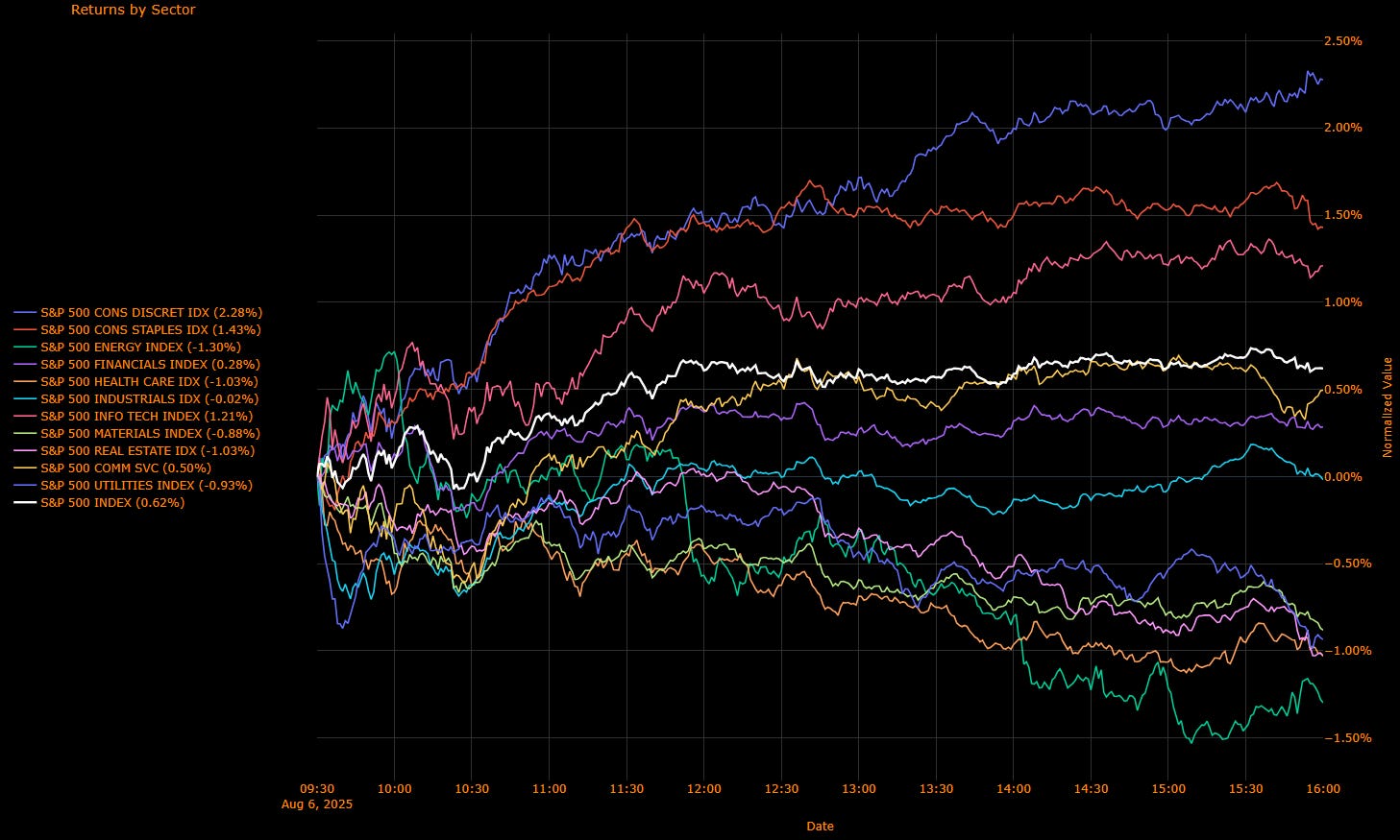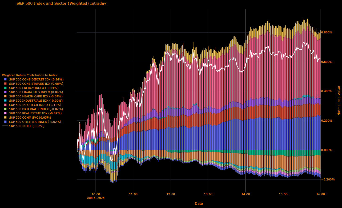 Info Tech (+0.41 pp) – Apple’s surge did the heavy lifting, buoyed by news of its domestic expansion push to preempt new tariffs. Other AI-adjacent names followed suit.