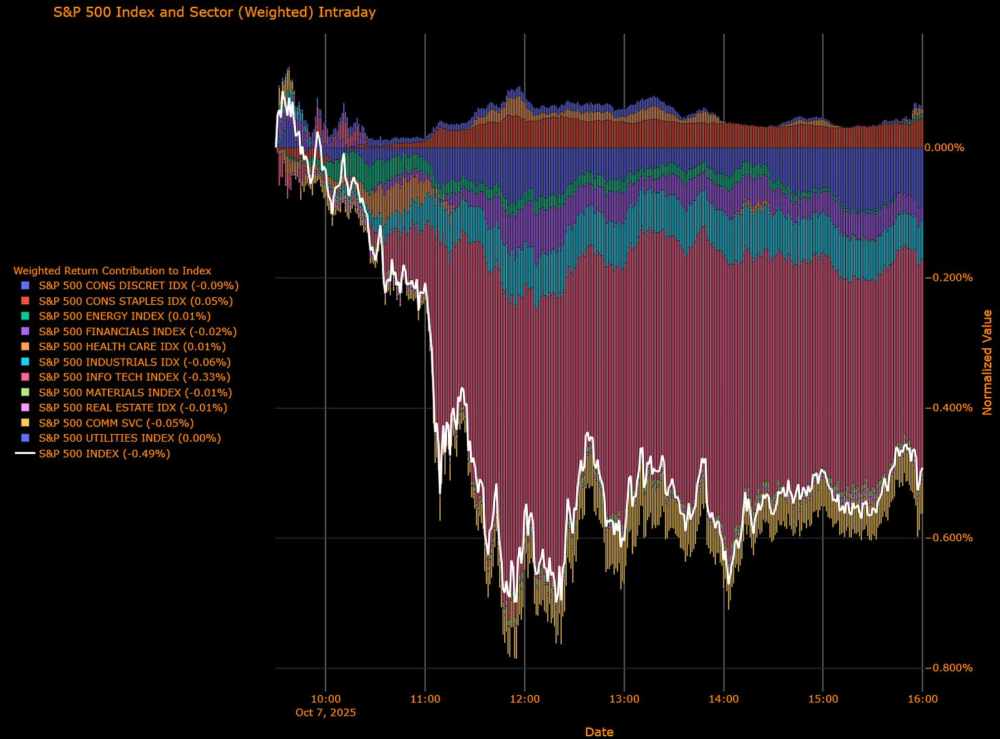 Drags: Info Tech (–0.33%), Discretionary (–0.09%), Industrials (–0.06%), Comm Services (–0.05%)
