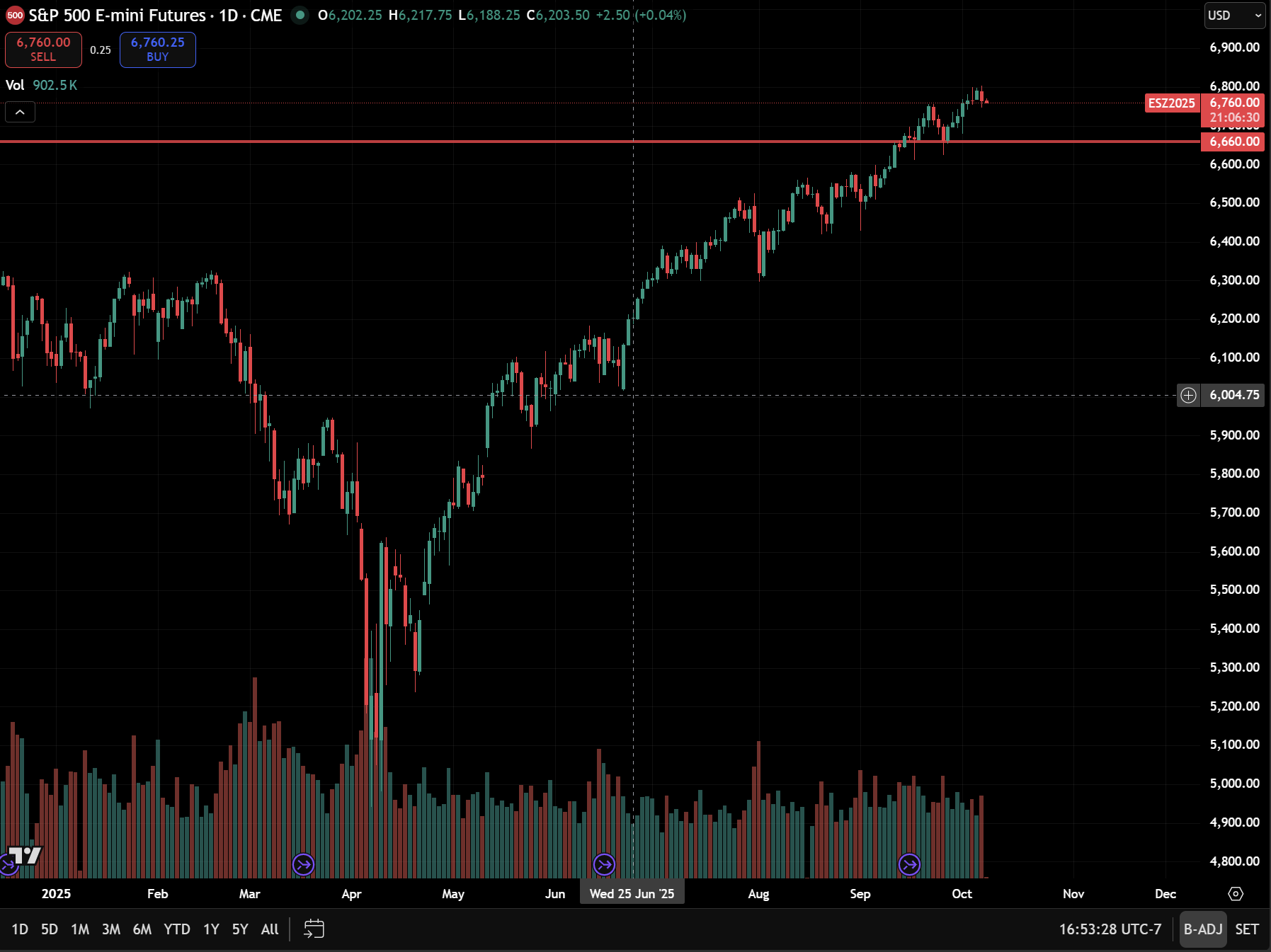 The dollar strengthened (+0.4%) as yen slid past 151.9 per dollar. Gold continued toward $4,000/oz (+0.5%), oil rose (+0.6%) to $62/bbl, and Bitcoin dropped (–2.6%). Credit and rates markets stayed orderly, signaling that this was a position-driven pause, not a risk-off rotation.