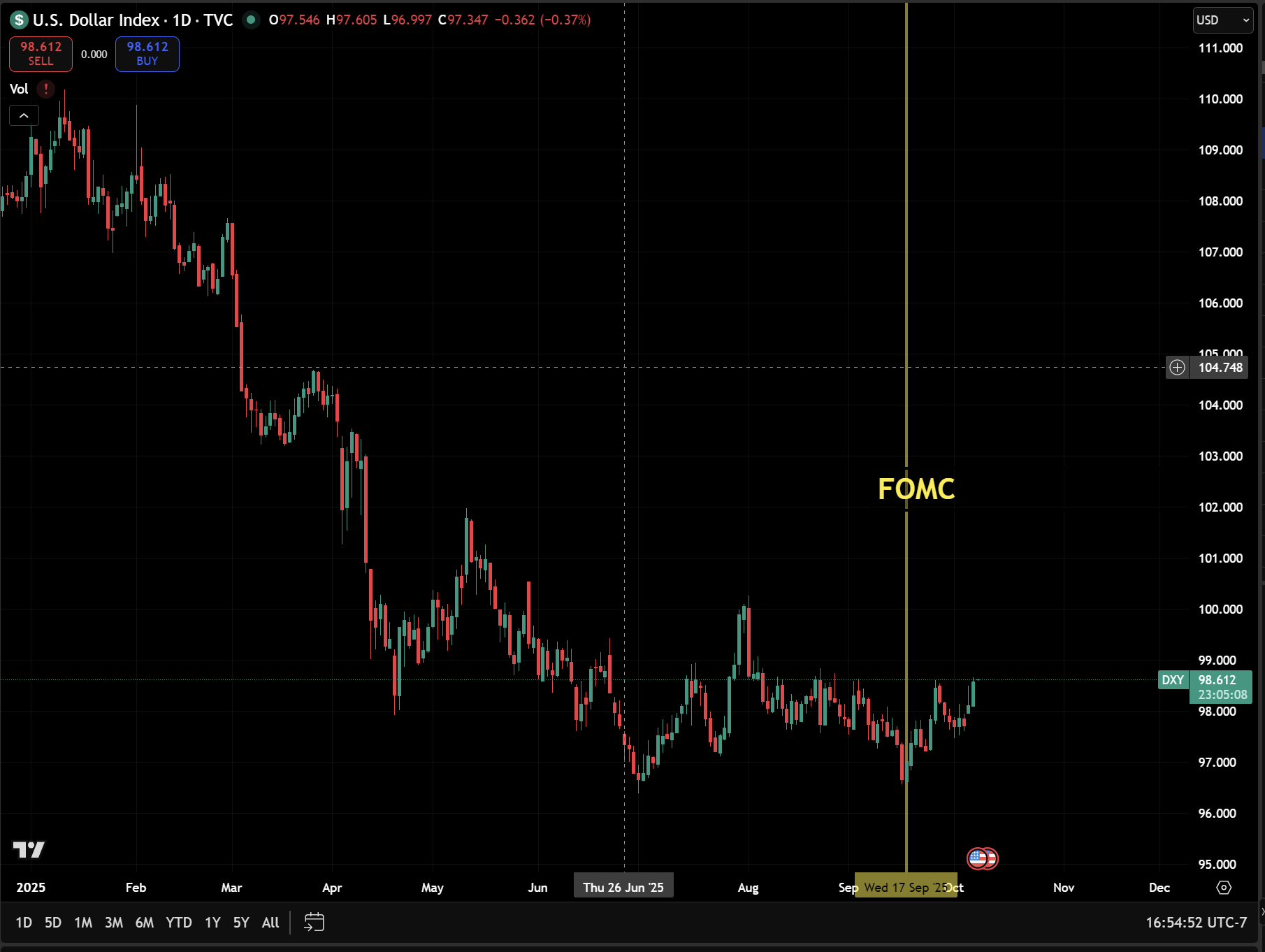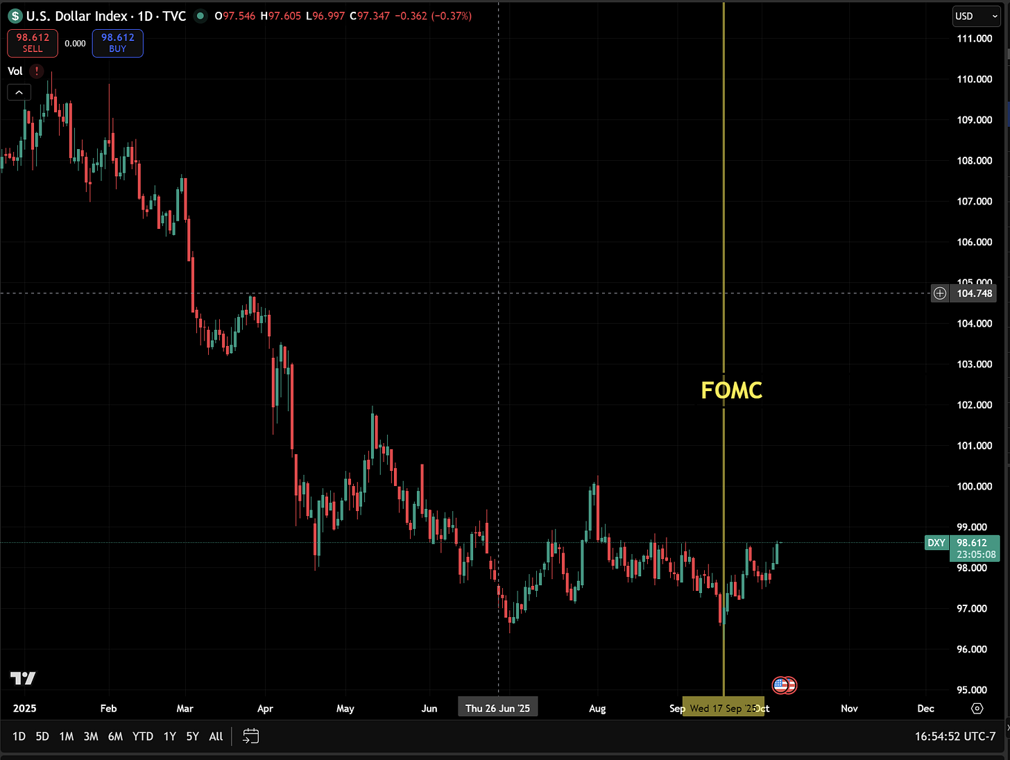 Yields drifted lower (10-yr 4.13%, –3 bp) as a solid Treasury auction offset hawkish comments from Minneapolis Fed’s Kashkari and a sanguine read from Governor Miran. Miran reiterated that tariffs pose limited inflation risk and that policy remains overly restrictive, implying scope for continued easing. Markets still price October as a live meeting for a 25 bp cut, but Fed messaging suggests incremental moves will stay data-dependent, especially given the risk of a government data blackout if the shutdown persists.