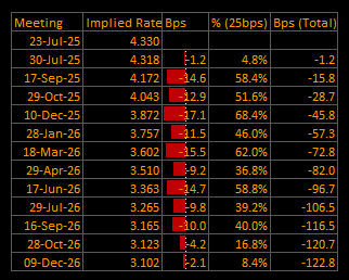 Despite mounting threats of 30–100% tariffs on EU, China, and Philippine goods, the market still sees no impact on the Fed’s easing path. July and September implied rates are nearly unchanged. That’s a risky assumption if tariffs re-ignite goods inflation or provoke supply-chain friction, the Fed may find its hand stayed longer than markets anticipate.