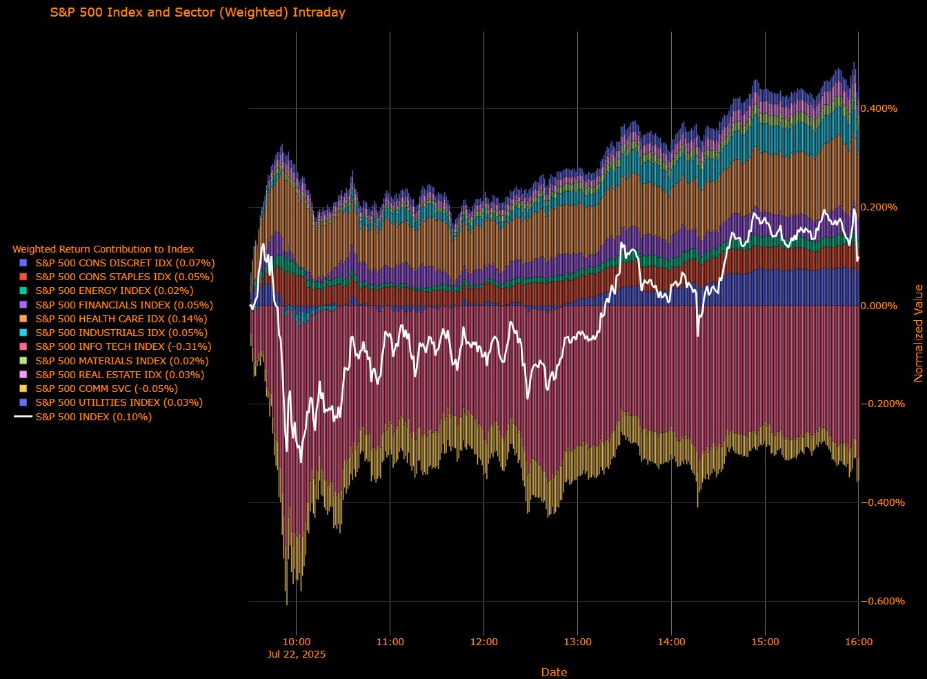 Info Tech (–0.31 pp) – Clear laggard. Semis and software sold off ahead of Alphabet’s print, dragging on the index despite the broader gain.