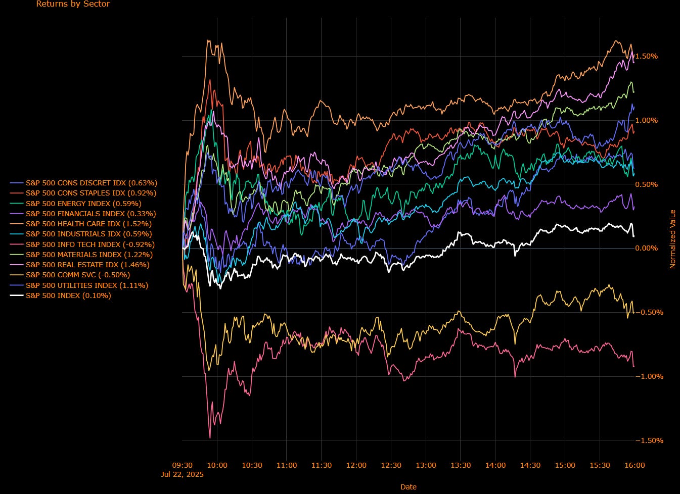 Health Care (+1.52%) – Strongest performer, extending leadership. Strength in managed care and pharma; viewed as a safe harbor pre-earnings.