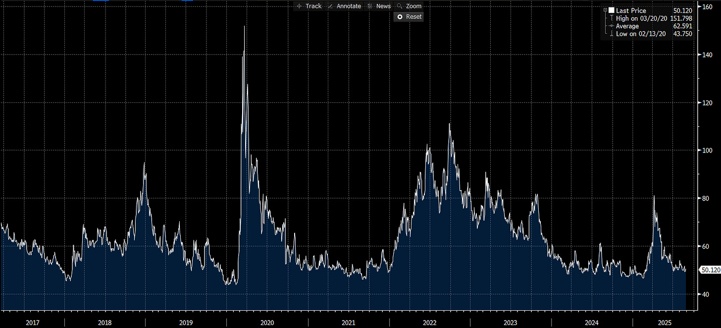 IG OAS: 50.12 bp • 5-yr avg: 62.59 bp (12.5 bp inside) • Cycle low: 43.75 bp (6.4 bp off tights) • COVID high: 151.80 bp (~101.7 bp tighter)