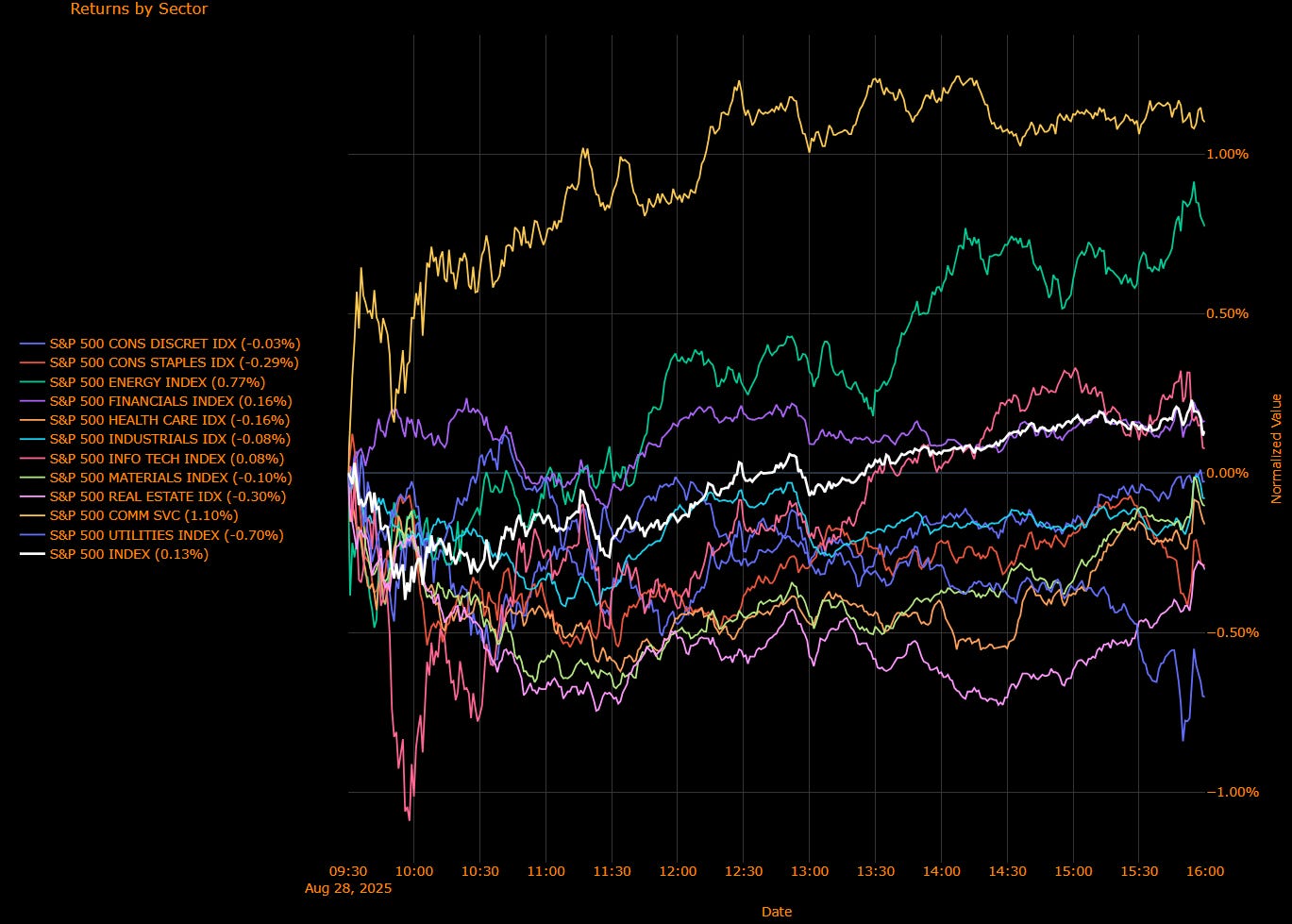 A September 25 bp cut remains the market anchor; today’s flattening says “watch the front end” into PCE. In-line/softer core PCE likely extends the grind higher with leadership in AI-adjacent and comms; a hot print risks a brief de-risking and deeper flattening. Near-term pivots: Friday core PCE, 5s30s behavior into month/quarter-end, and whether Comm Services’ concentrated lift can broaden without defensives rolling over.