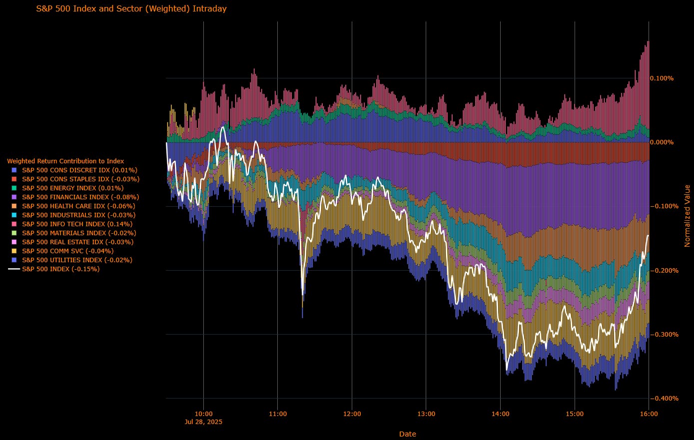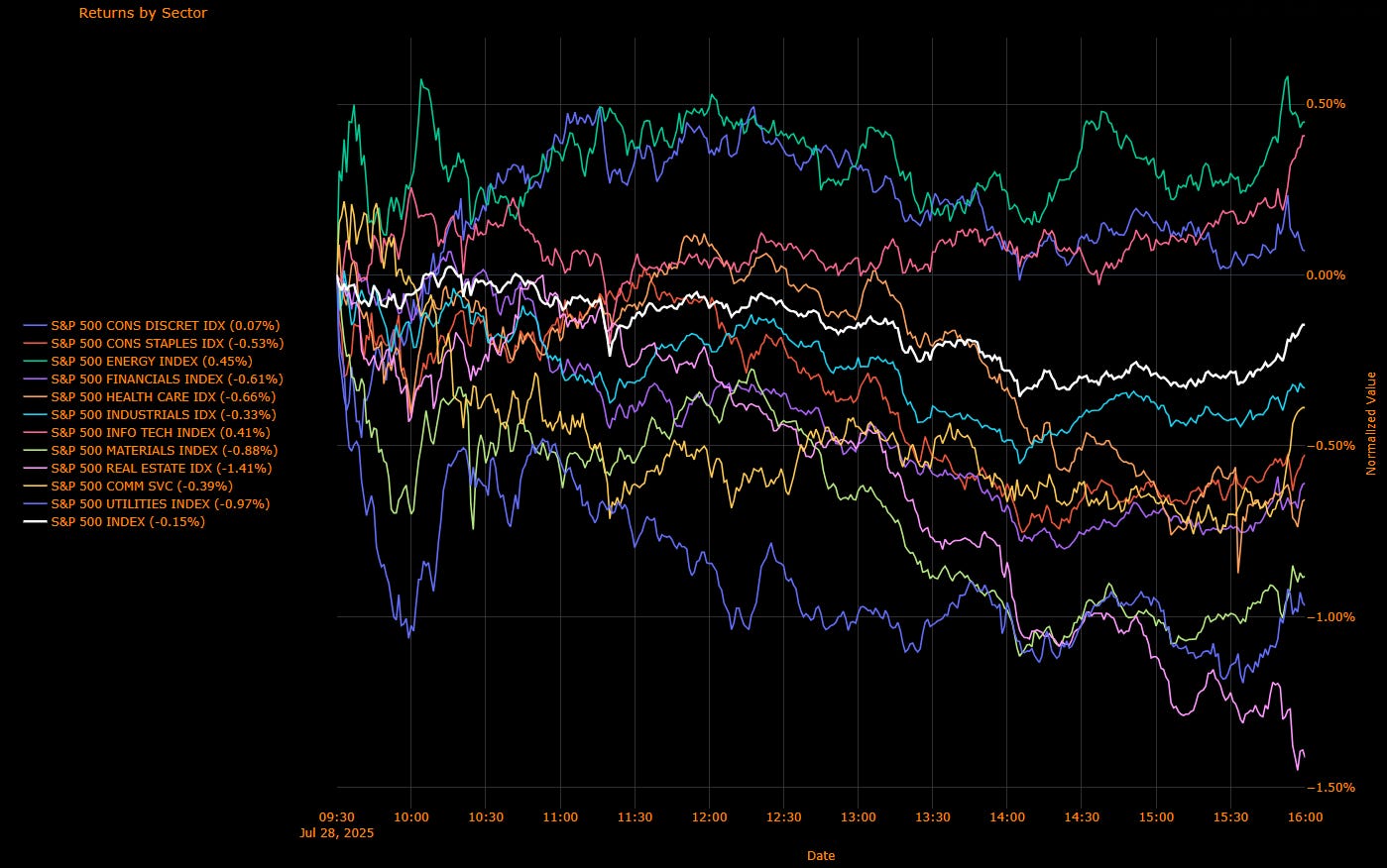 The S&P 500 closed down 0.15% Monday in a session defined by sharp defensive underperformance and a market leaning more cautiously into the week’s macro gauntlet. Under the hood, the selloff was deceptively uneven: Tech and Energy rose, while Real Estate, Utilities, and Materials led a broad decline in rate-sensitive and tariff-exposed names. With investors front-running the Fed, the QRA, and a loaded week of earnings, the rotation turned sour beneath the surface.