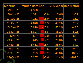Despite a finalized EU deal and ongoing China negotiations, the tariff risk hasn't dissipated it’s metastasizing. Trump’s rhetoric is firming: 15% is the floor, not the ceiling. While Canada, the UK, and other holdouts negotiate, over 200 tariff notices are due this week. The curve still doesn’t reflect much front-loaded inflation risk, nor does it price a disruption in supply chains that could complicate rate cuts. That's a blind spot.