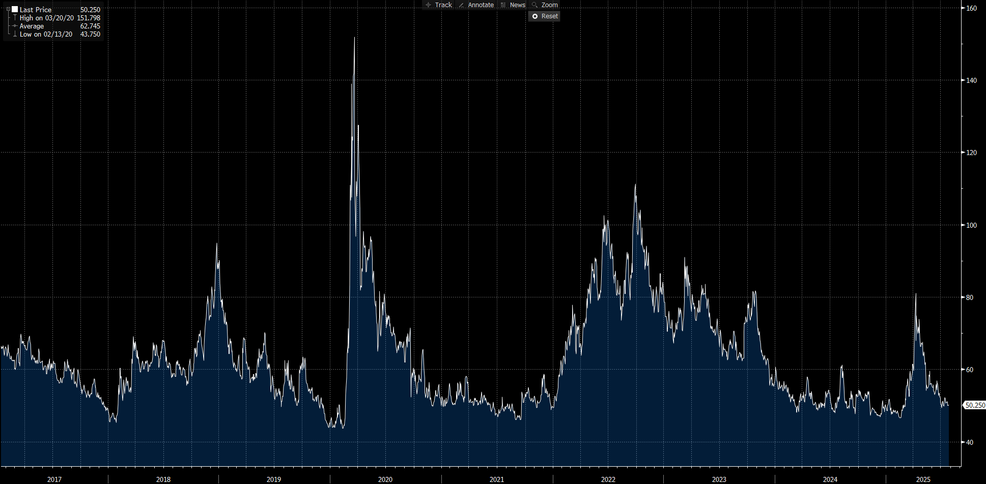 Current IG Spread: 50.25 bp | 5-Year Avg: 62.74 bp | COVID High: 151.80 bp | Cycle Low: 43.75 bp