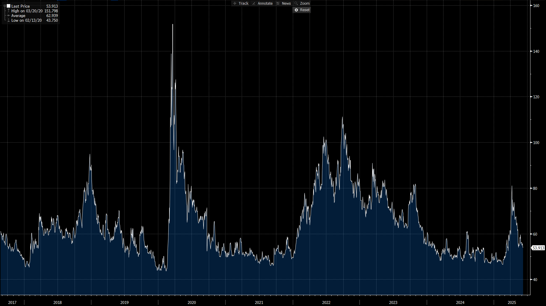 Current Spread: 53.91 bp (▼ ~1.6 bp d/d), indicating a modest narrowing of spreads. The current level remains below the 5-year historical average (~63 bp), suggesting cautious investor optimism despite persistent macroeconomic uncertainties.