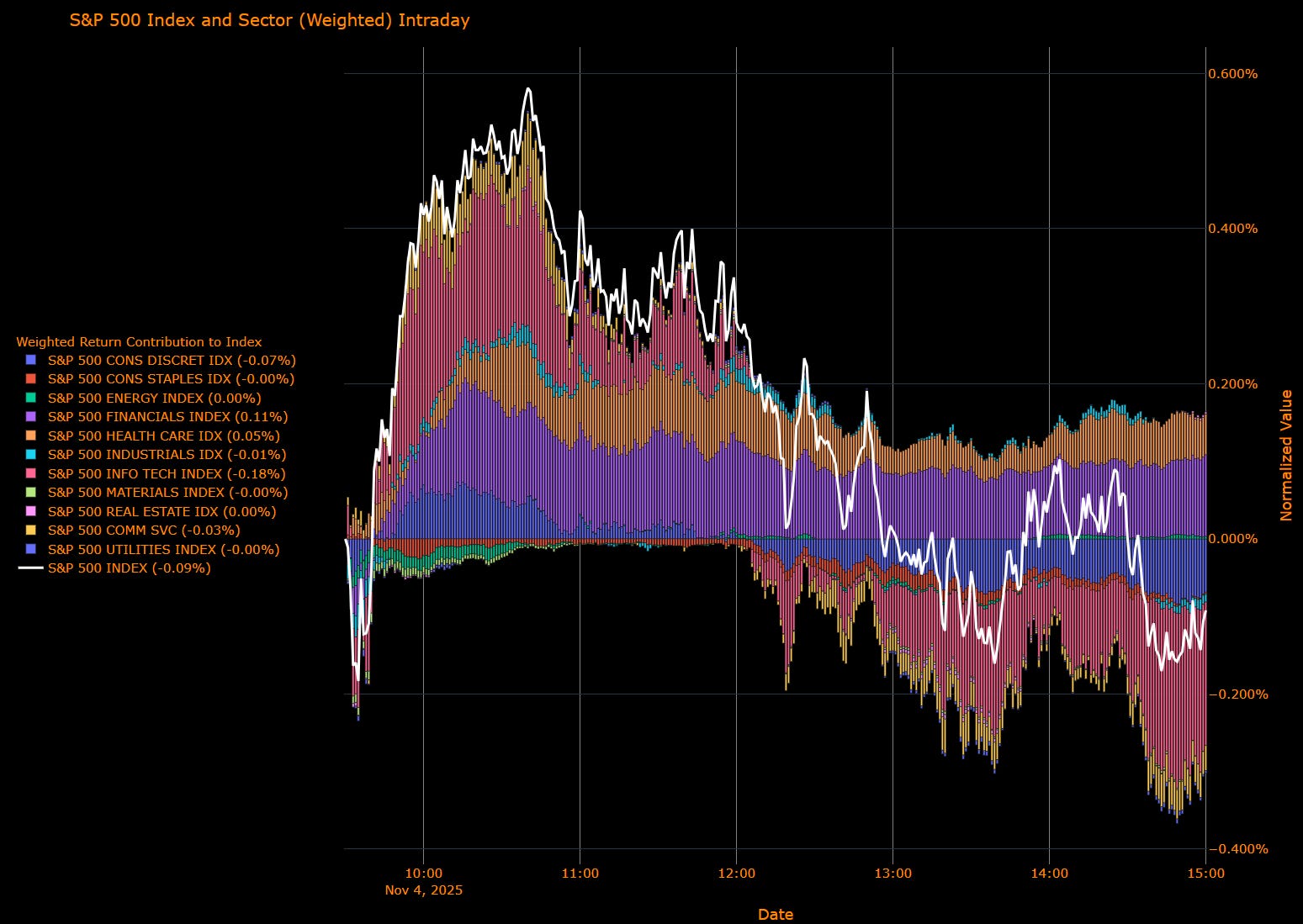 Intraday pattern: early surge, steady bleed into the close—classic “sell the strength” day with Tech/Disc fading and Financials/HC absorbing.