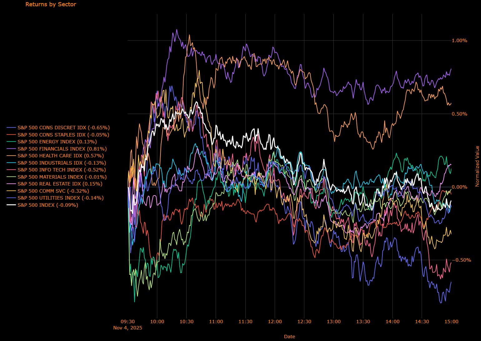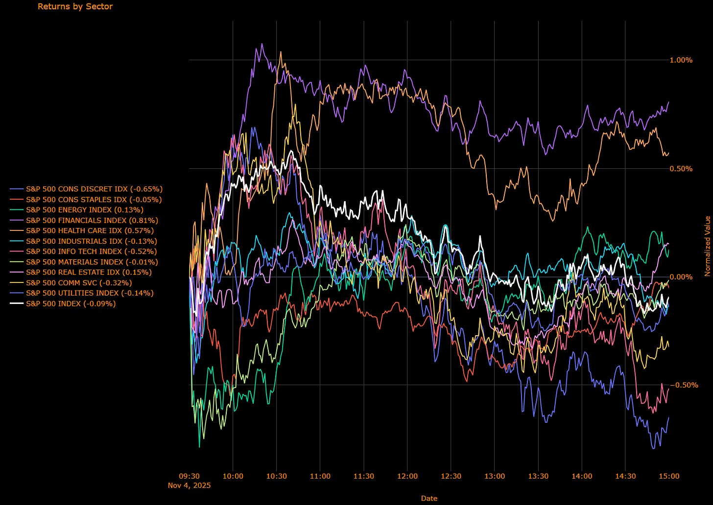 US Market Wrap: Early Pop, Late Fade; S&P −0.09%, Tech/Disc Drag, Financials/Health Care Cushions