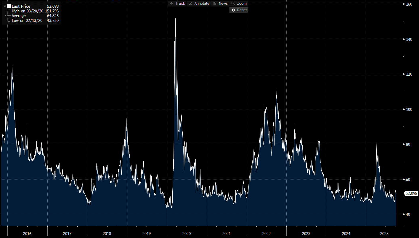 (Chart stats: Last 52.098 | High 151.798 on 03/20/20 | Avg 64.825 | Low 43.750 on 02/13/20.)