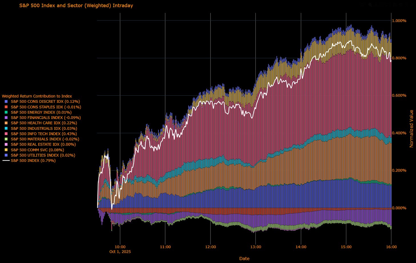 The S&P 500 rose 0.79%, extending its rally to a fourth straight session and closing at a fresh record high. Strength came from defensives and rate-sensitive growth sectors, with Health Care and Info Tech providing the bulk of the lift, while Financials and Materials lagged. The backdrop remains defined by the government shutdown, which threatens to delay Friday’s payrolls release, leaving the Fed reliant on private data and proxies to gauge labor momentum.