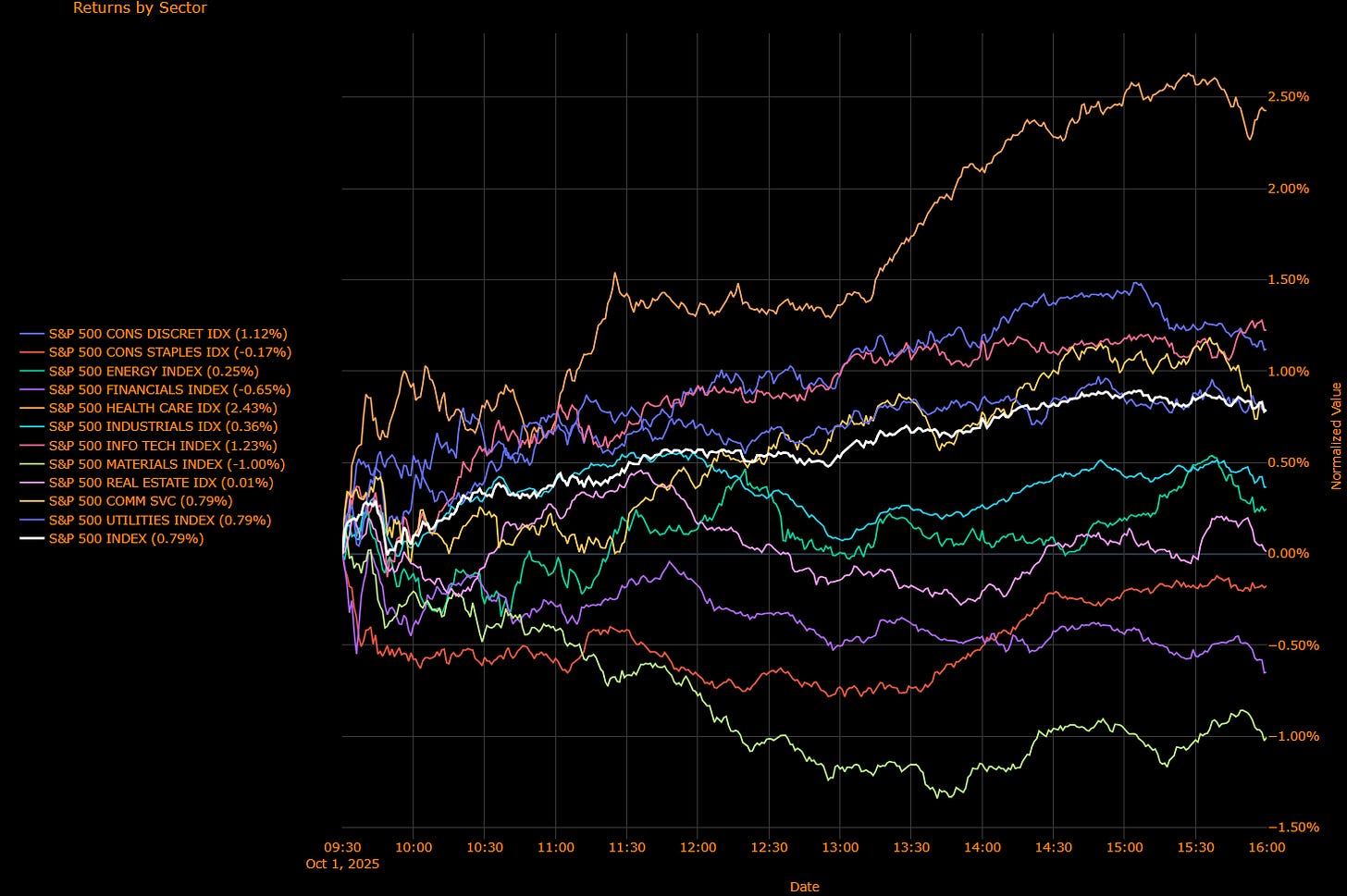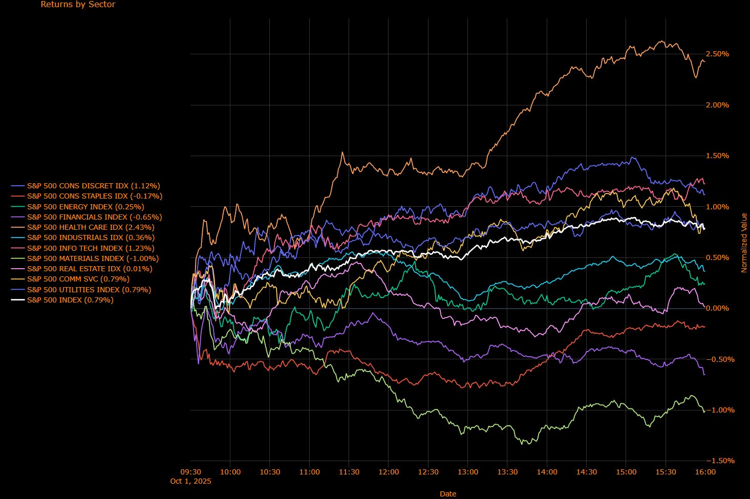 US Market Wrap: Health Care & Tech Carry Gains as Shutdown Clouds Data (S&P +0.79%)