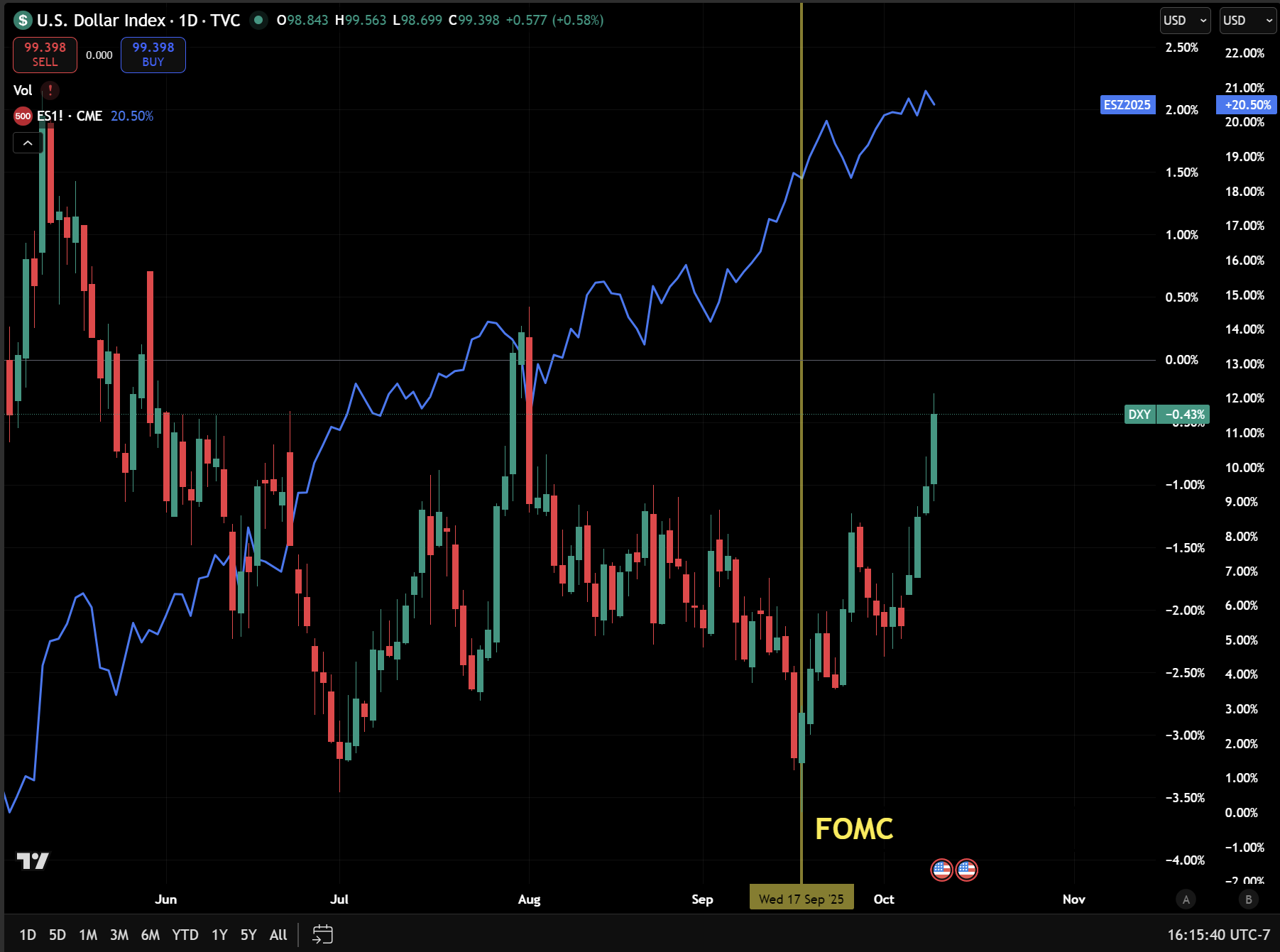 Rates & FX: 10-yr USTs edged up to ~4.14%, curve little changed; USD pushed to a 10-week high—both consistent with the cyclical softness in equities. Gold slipped back below $4,000/oz; oil fell as Middle East risk premia eased.