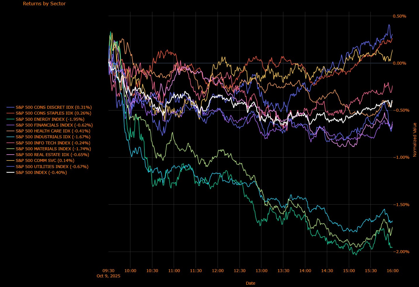 Flows & positioning: After a powerful run, breadth is tiring and “buy-the-dip” is meeting a bit more resistance. AI remains the secular bid, but today’s tape favored defensives at the margin while economically sensitive groups (Energy/Industrials/Materials) bore the brunt.