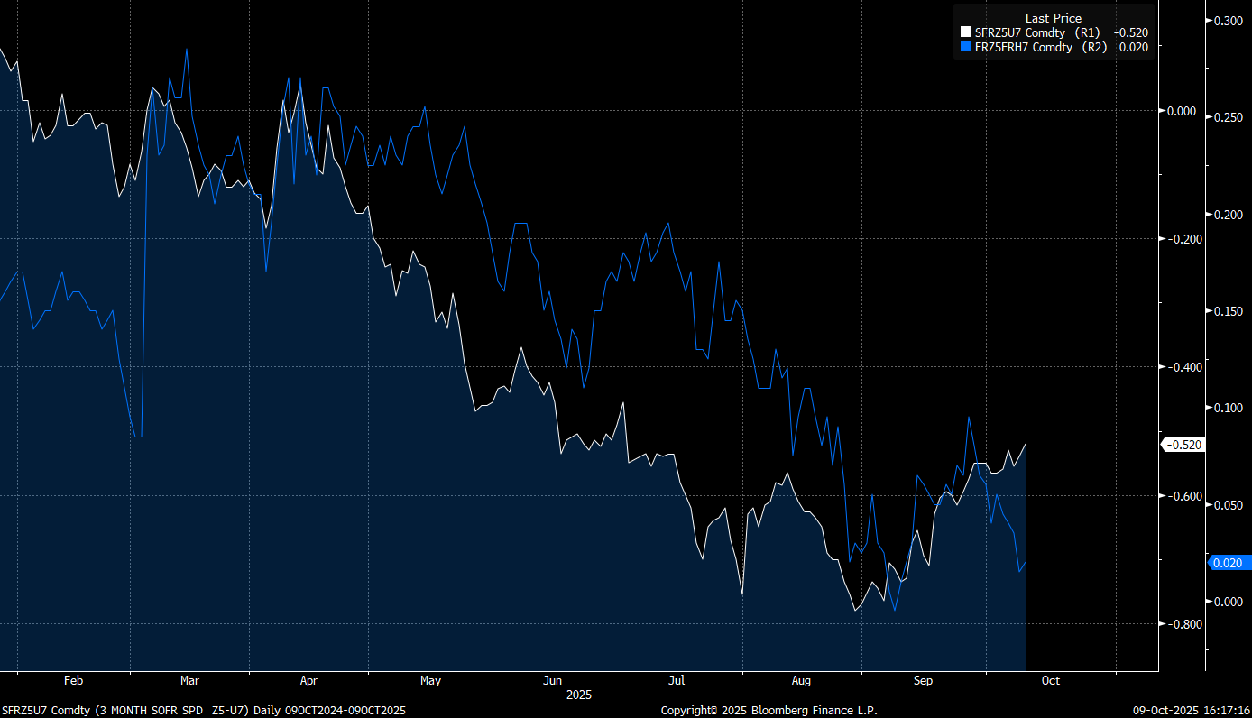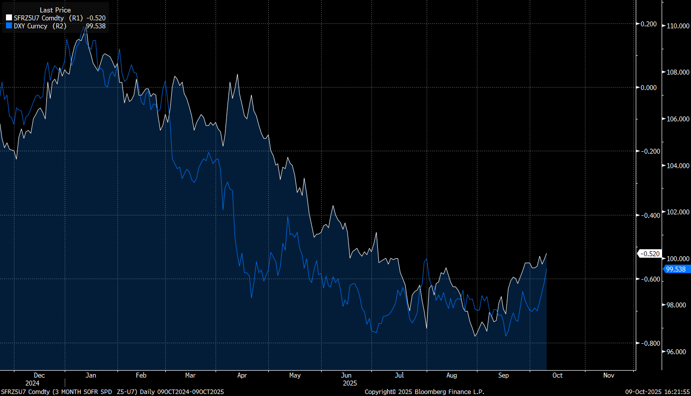 Here is the basic idea, since the Fed and the market have baked in 2 more cuts for this year, everyone is shifting to HOW MANY cuts take place in 2026. The SOFR spread below shows how many cuts the market is pricing in 2026, all the way till Sept of 2027 (which is where the terminal rate sits). So if we assume two cuts are happening this year, as the white line in the chart below moves DOWN, we price more cuts and fuctionally inject a lower price of money into the system. Inversely, if we move UP, we are pricing fewer cuts in the system, which functionally increases the price of money in the system for dollars. The blue line in the chart below shows the same period of time in the Eurozone which has actually fallen over the last 10 trading days. The bottom line is the US as priced less cuts since FOMC while the Eurozone only moved marginally. The net result is the dollar rising against the Euro.