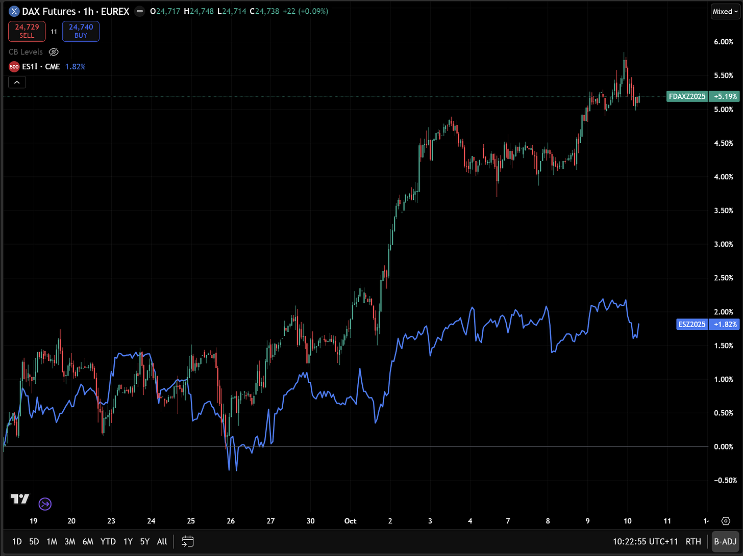 Now think about this for a moment, if the Eurozone just priced marginally more cuts as the US tightened a bit, does it begin to make sense why the DAX has outperformed US equities over the last 15 or so trading days?