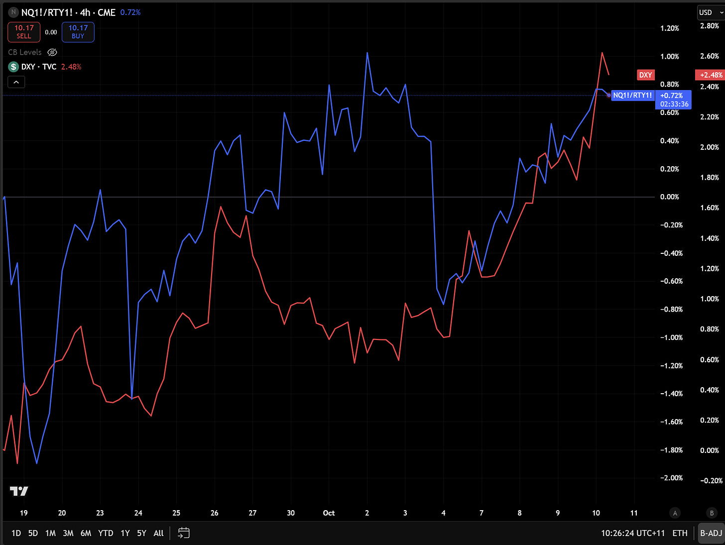 Now, to be clear, we are not seeing the stronger dollar pull broad equity indicies down. Why? Because it is a shift in monetary policy differentials, not a shortage of dollars, causing systemic risk. The effect is being felt, though, why is why we are seeing the Russell underperform the NASDAQ marginally as the dollar has been making its upward moves: