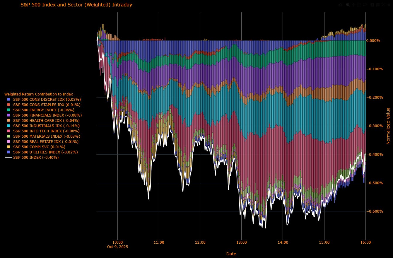 Concentration risk cuts both ways. When Tech isn’t carrying, the index struggles—today’s negative contribution from Info Tech plus weakness in cyclicals left the S&P in the red despite small defensive gains.