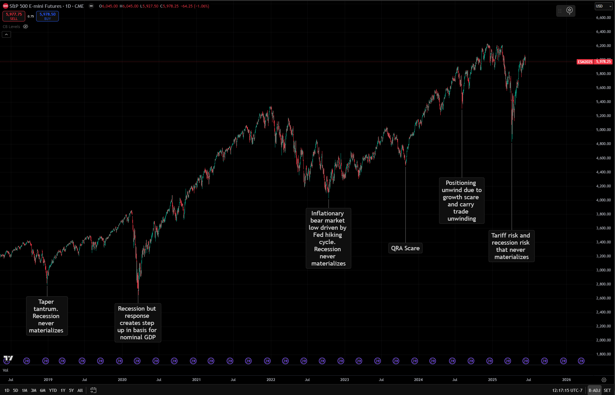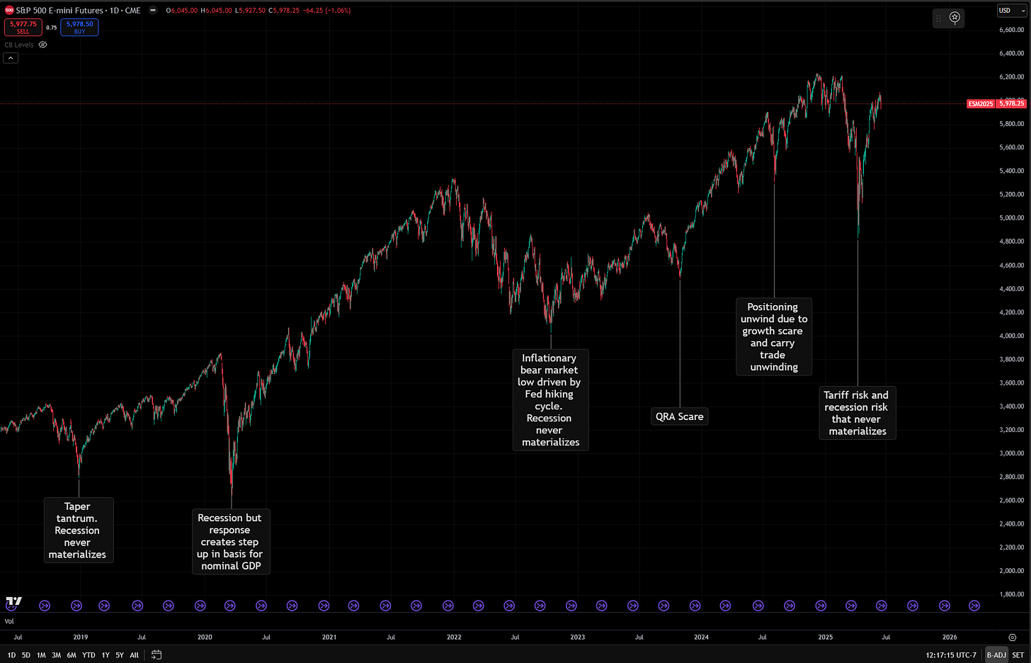 What I want to focus on here is HOW to think about the trend in equities as it relates to the macro regime. What is important to recognize is that growth and liquidity remain firmly squared to the upside right now. Why does this matter? Because it is easy to have a marginal positioning unwind in equities without a durable change in the underlying regime. For example, almost every major drawdown we have seen over the past 7 years has been extrapolated into a recession. The one recession we did get in 2020 was so short-lived because of the nature of the pandemic (lockdowns and reopenings) as well as the fiscal/monetary response.