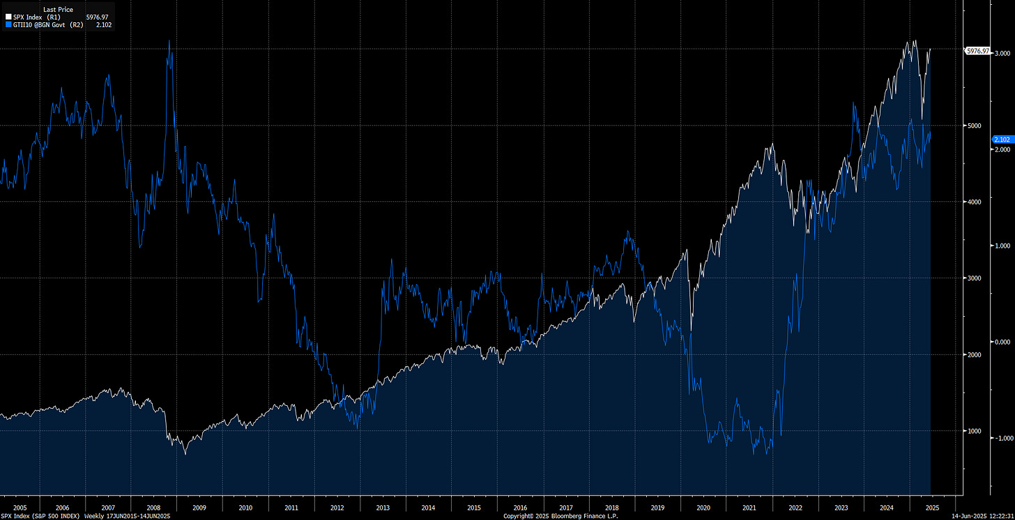Equities have continued to rally even as real rates are at decade-high levels. Why is this? It doesn’t have anything to do with dollar devaluation or the changing monetary system: