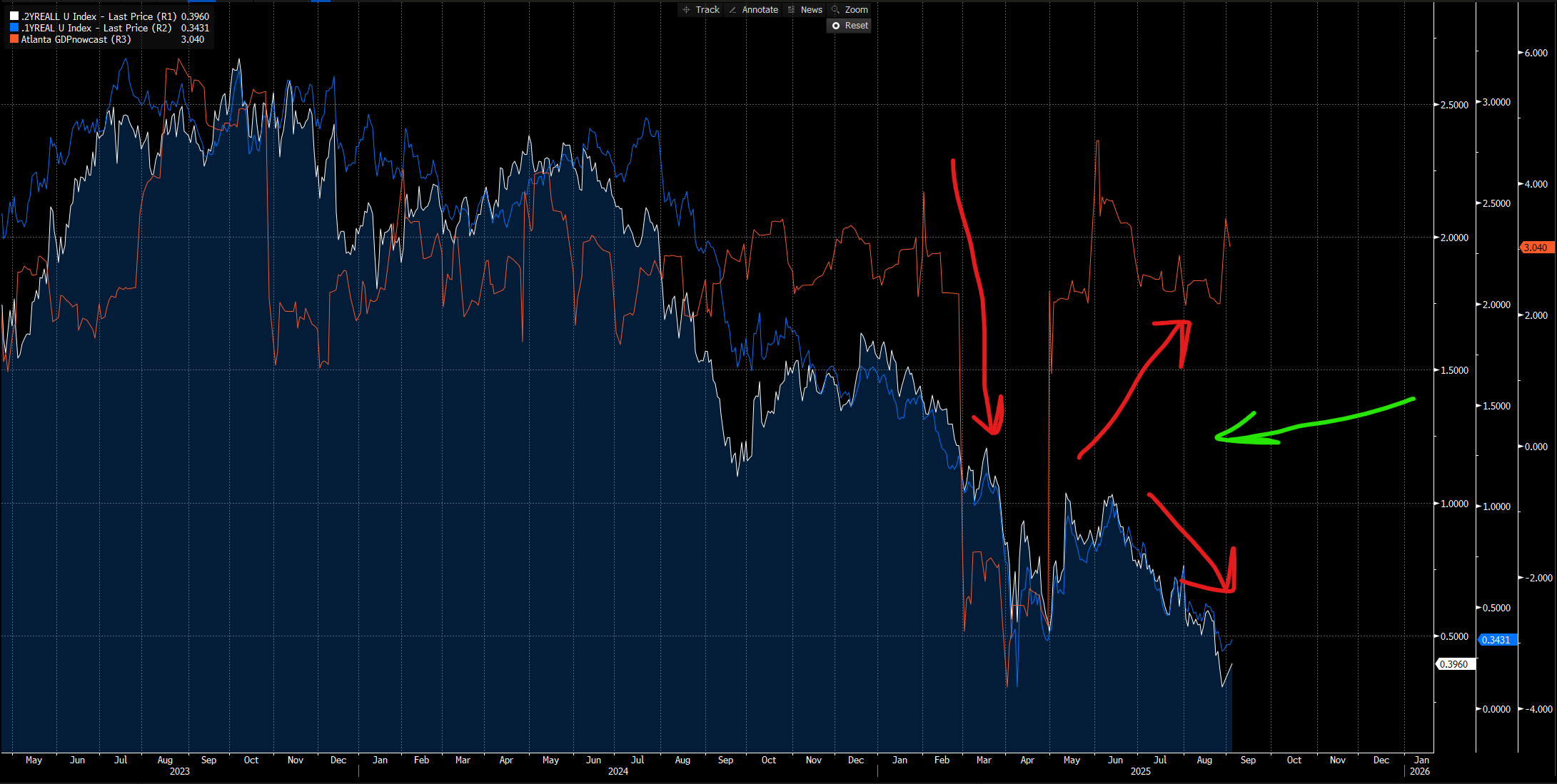 1y and 2y real rates have fell considerably during the contraction of Q2 in the GDPnowcast. Since growth has rebounded, real rates on the short end have only moved lower as growth moved up and remains elevated. In simple terms, the Fed is being very accommodative as growth remains resilient.