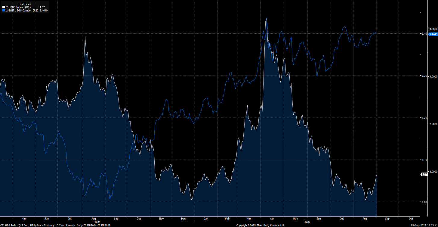 This dynamic is showing up clearly in the bear steepening and steepener-twisting of the 10s30s curve at the same time the Russell 2000 has been rallying. As short end real rates fall with Fed cuts, capital is being pushed out the risk curve, and long-end yields are adjusting higher to reflect the inflation and financing risks embedded in that move. The steepening of the long end is a direct expression of how balance sheets and capital structures are leaning into lower front-end costs, extending credit and leverage while risk premiums remain compressed. Small caps, which are highly sensitive to financing conditions AND cyclical growth conditions, have responded with outsized gains, but this rally is taking place against the backdrop of a curve that is flashing the pressure of elevated inflation expectations and the systemic demand for credit. What looks like resilience in equities is, in part the byproduct of capital structures absorbing volatility in a way that shifts fragility further into the future.