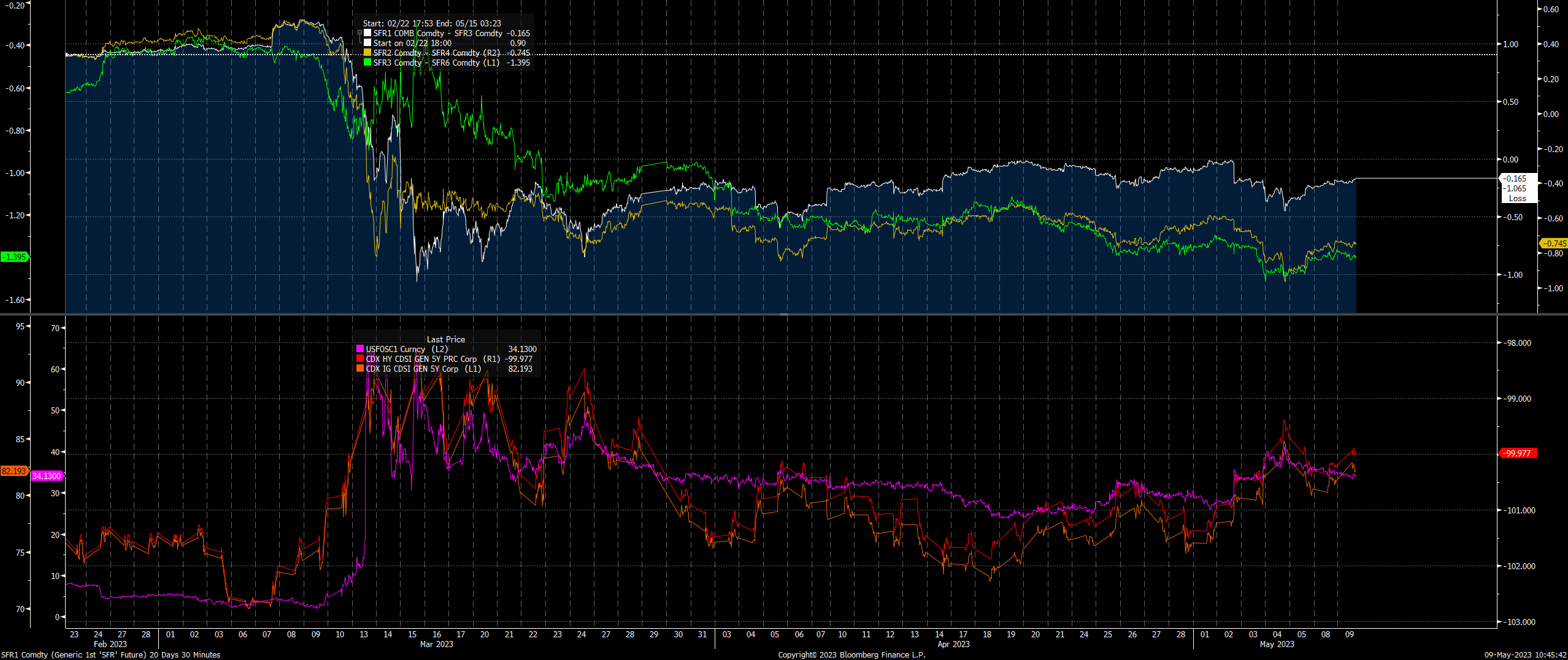 The top panel of the chart has spreads between SOFR contracts. The bottom is the FRA-OIS and CDX indices. Basically, the top chart is showing how the market is pricing the forward curve of rate hikes/cuts and the bottom chart is showing credit risk.