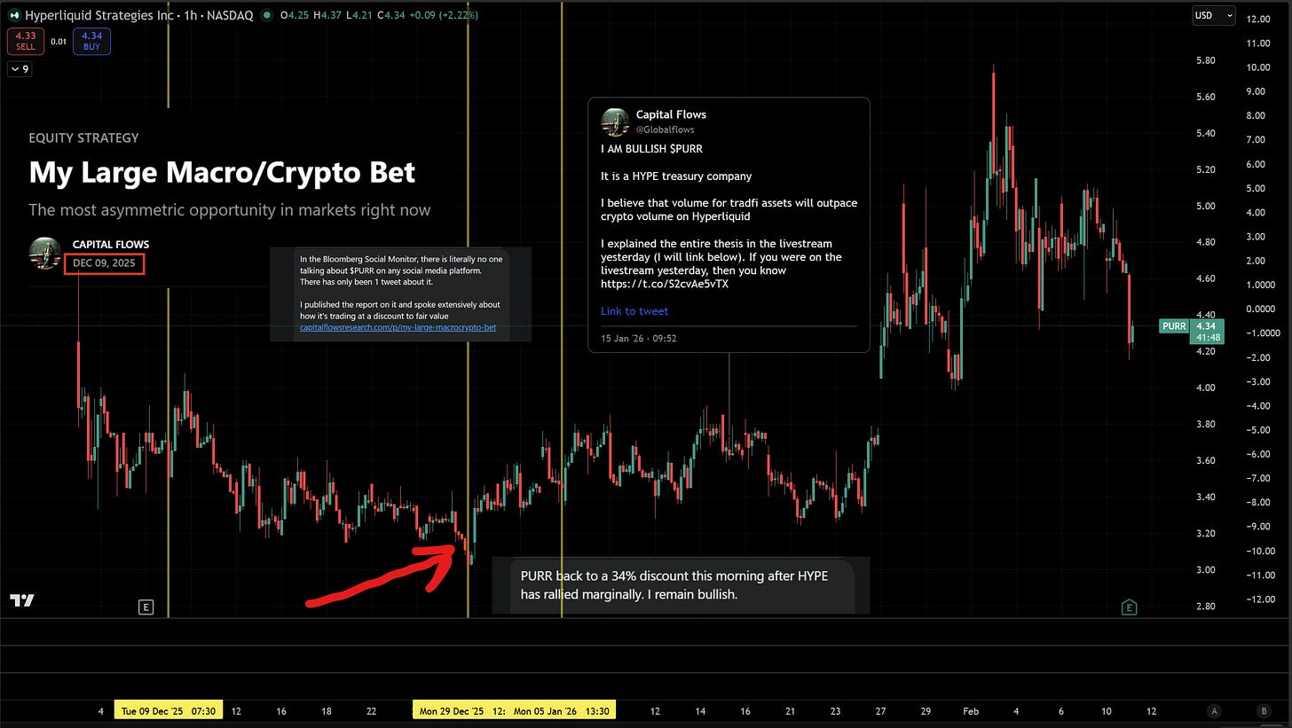 PURR has been one of those bets from the very beginning. I first published the thesis on December 9, 2025, titled “My Large Macro/Crypto Bet,” when Bloomberg Social Monitor showed literally no one was talking about $PURR on any social media platform. There had been one tweet about it. One. I published the full research report (link), spoke extensively on the livestream about how it was trading at a discount to fair value, and laid out why I believed volume for traditional financial assets would outpace crypto volume on Hyperliquid.
