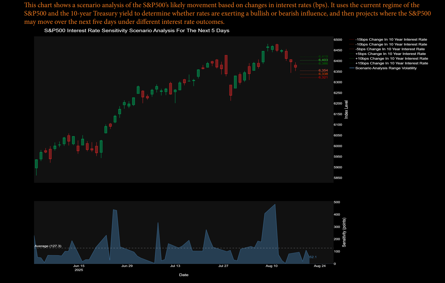 Then we take this regime and say, based on the current regime that we are in, where is the S&P500 likely to move for every bps change in interest rates? This could be to the upside OR to the downside. The ranges and sensitivity to interest rates are always dynamic, so the bottom panel of this model shows HOW WIDE the current range in the scenario analysis is relative to history.