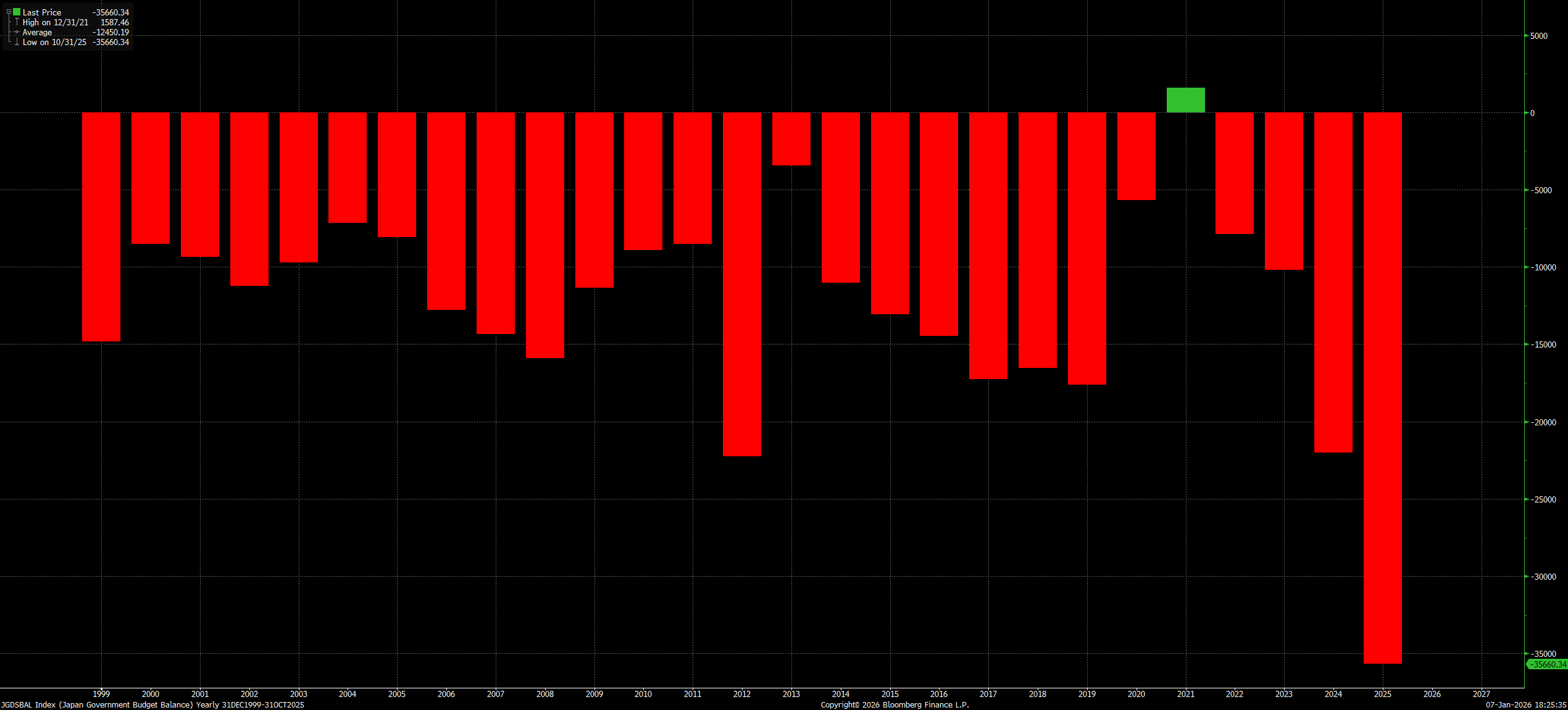 To give you an idea of HOW LARGE the change has been, here is the budget deficit in Japan right now. When it turns negative, it represents the Japanese government spending MORE than they take in.