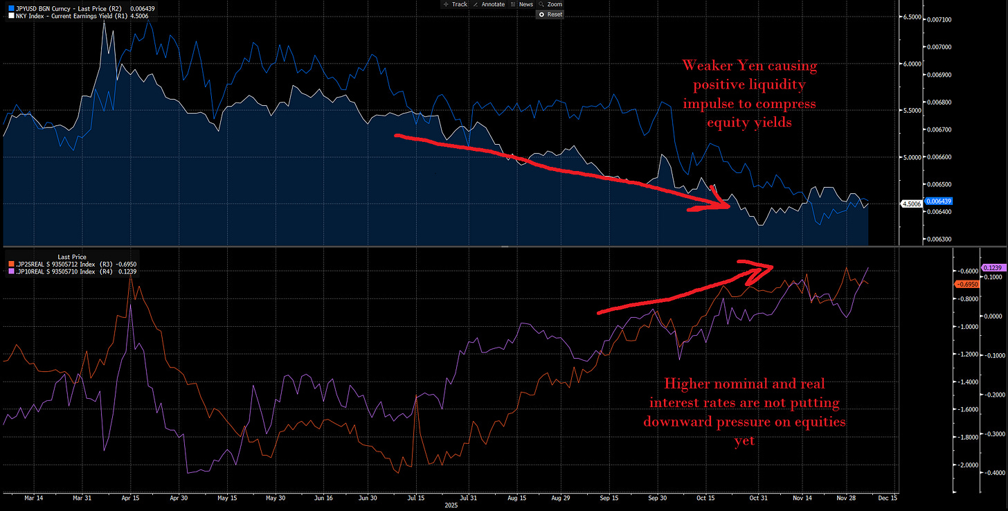 So how does Japan connect to this? We are seeing the weaker Yen bring in inflation AND more liquidity as the Nikkei earnings yield compresses. In simple terms, liquidity is driving the Nikkei higher, not domestic growth. As the quantity of money in the market and inflation in the economy rise, real yields are rising, but it’s clear that it is nowhere near enough for equities to fall.