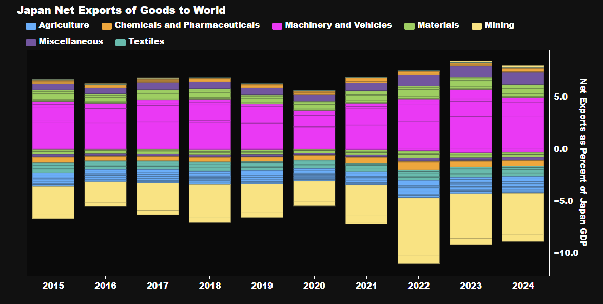 You will notice that Japan is a net importer of food (blue) and energy (tan)