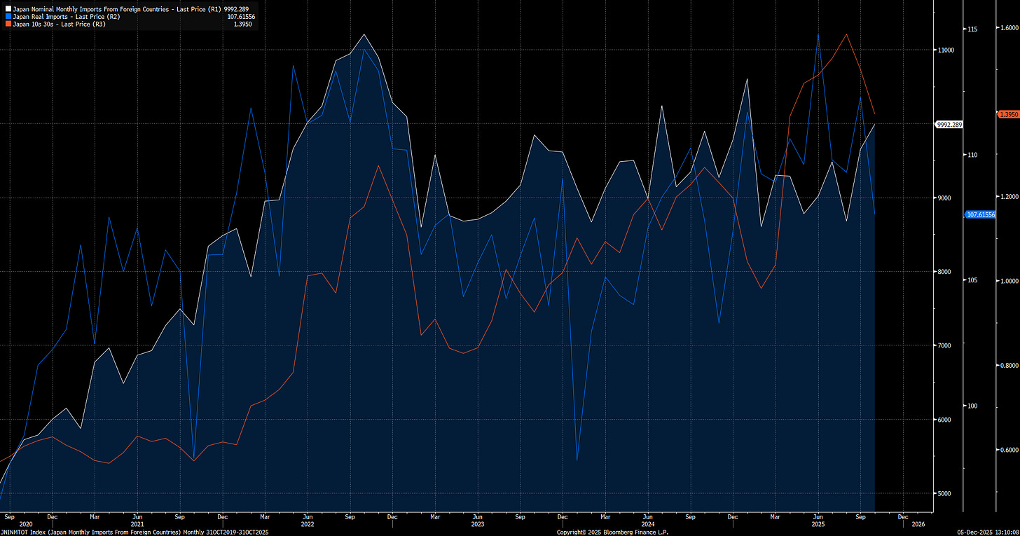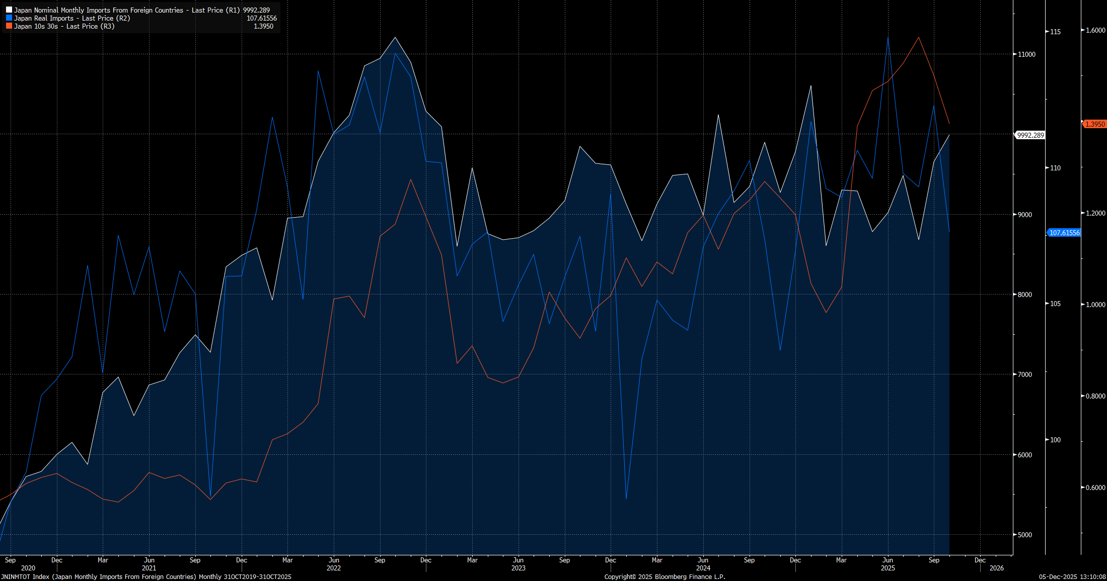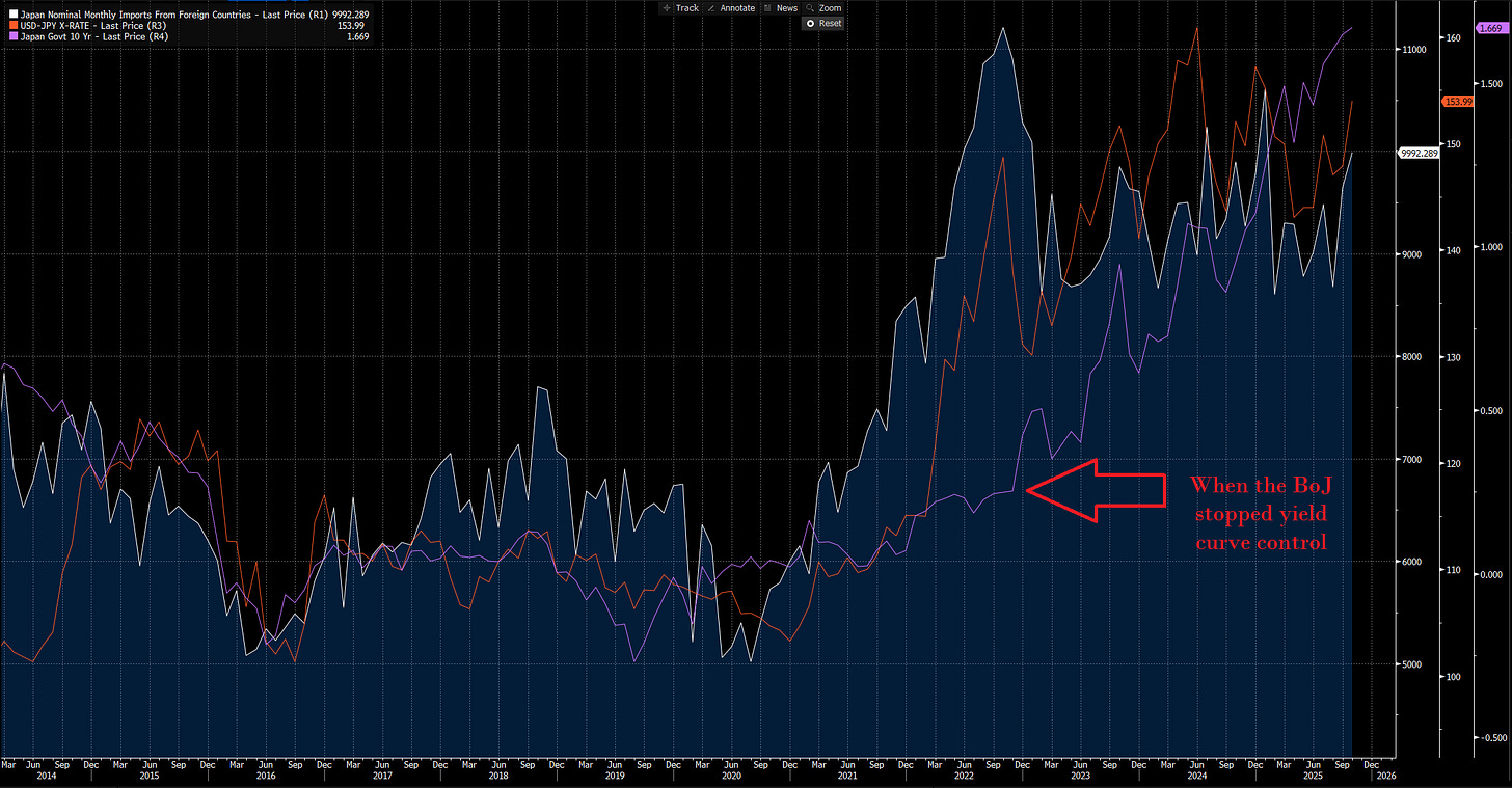 This structure of global trade and how Japan fits into it frames the reflexive feedback loop we are seeing taking place between yields, the yen, and domestic inflation.