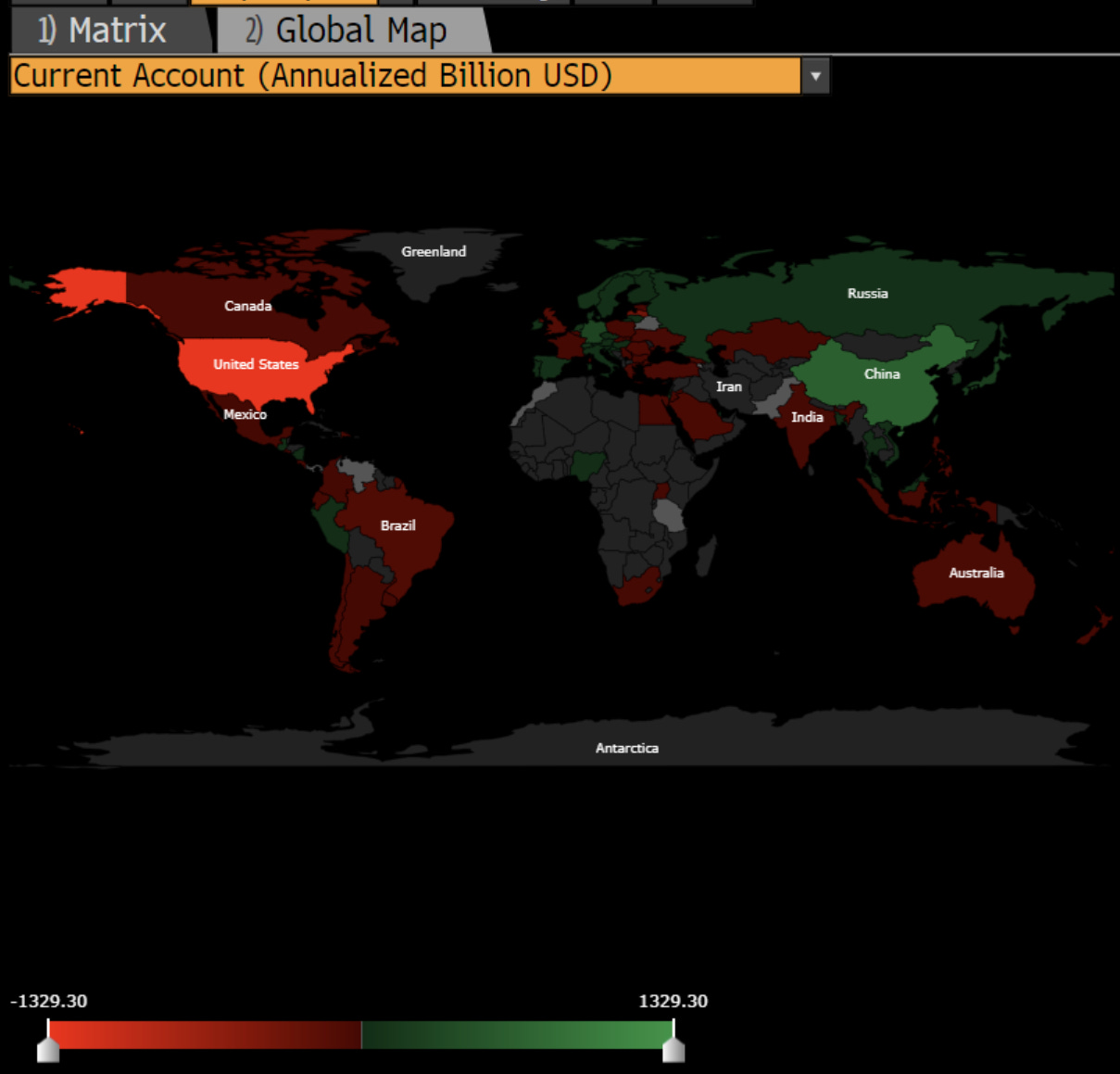 This entire system of global trade is distributed across countries that are either net importers or net exporters. The United States is the largest net IMPORTER in the world (the most red in the map below) while China is the largest net EXPORTER. Every other country falls in between these two countries.