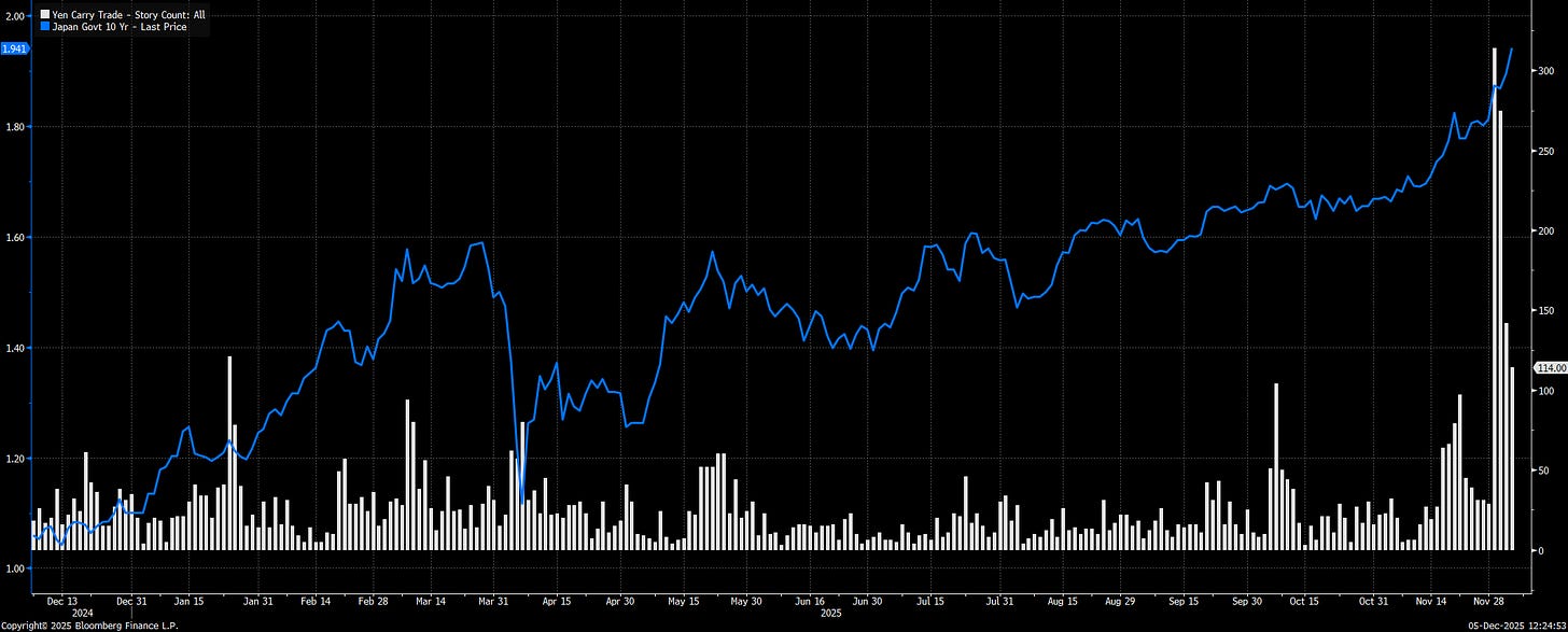 This level of integration means that understanding the global picture is no longer optional. Local shocks now transmit globally through exchange rates, interest rate differentials, offshore funding markets, and derivative exposures. What matters is not just WHO is levered but HOW that leverage is interconnected. Nowhere is this more evident than in Japan, one of the most systemically important players in global finance. Japanese government bonds and the yen sit at the center of an enormous web of carry trades, collateral chains, and duration mismatches. For years, investors have treated Japan as the stable anchor in global markets. In reality, the scale of leverage tied to JGBs and the yen means any structural shift in Japan’s policy stance has the potential to reverberate across every major asset class.