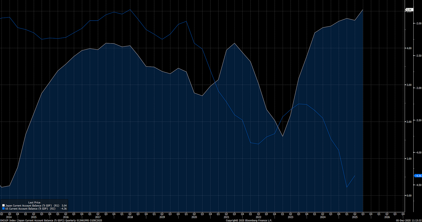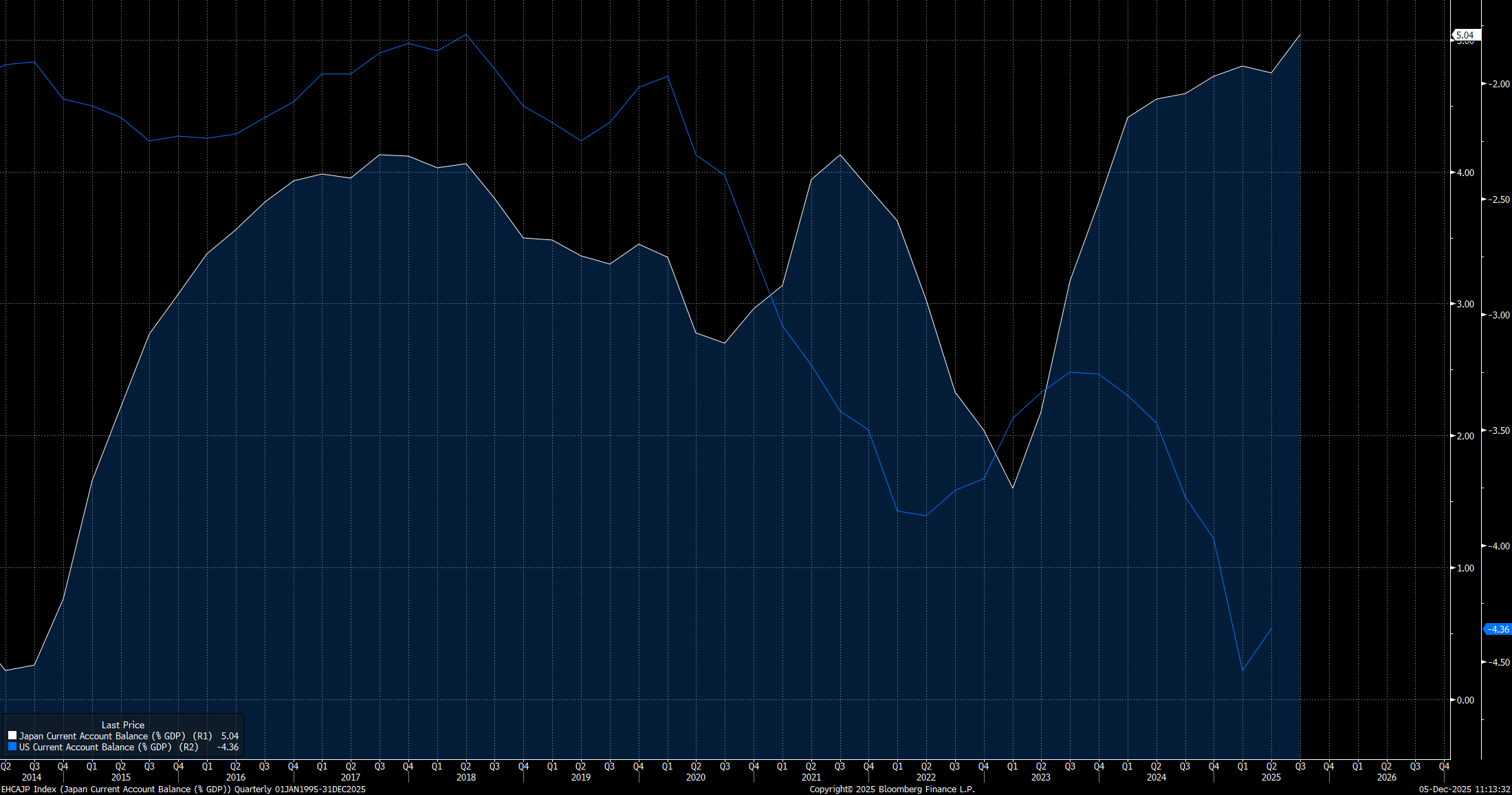 In simple terms, there is too much liquidity and inflation in Japan, which is resulting in higher yields, higher equity prices, and a weaker currency. On the US side, we are seeing too much liquidity in markets, but it isn’t materializing into inflation yet because of the weaker labor market and the fact that the US is not short food and energy prices like Japan.