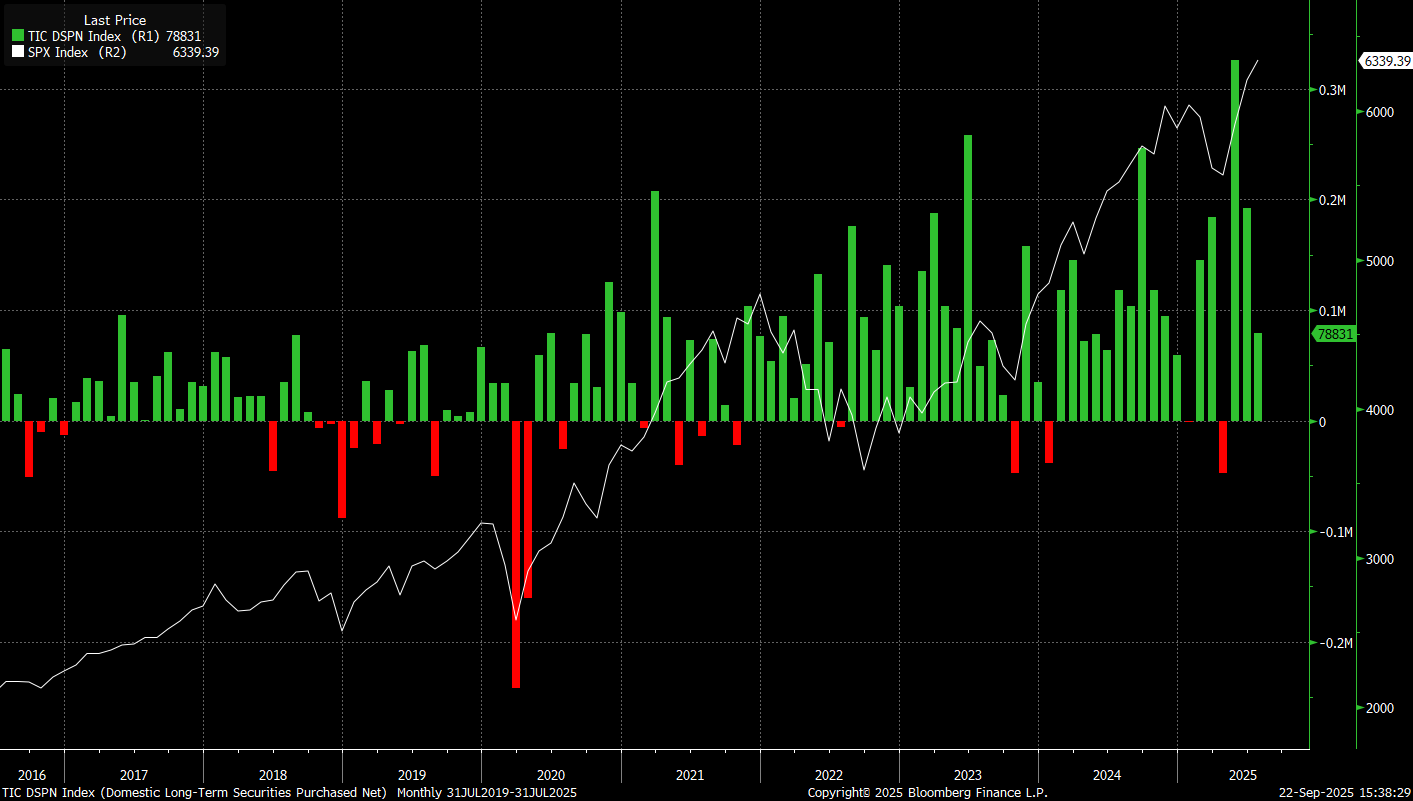 As everyone is becoming a Fed watcher, foreigners continue to buy US assets (net buying by foreigners).