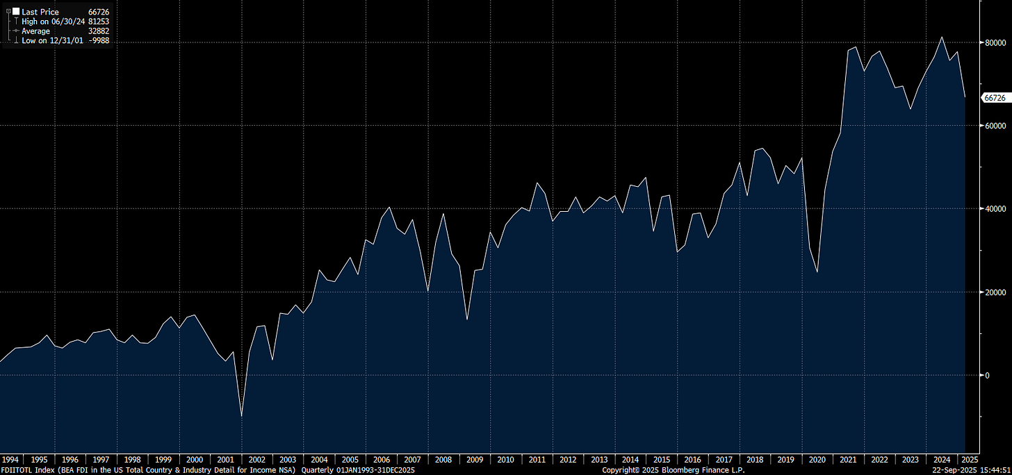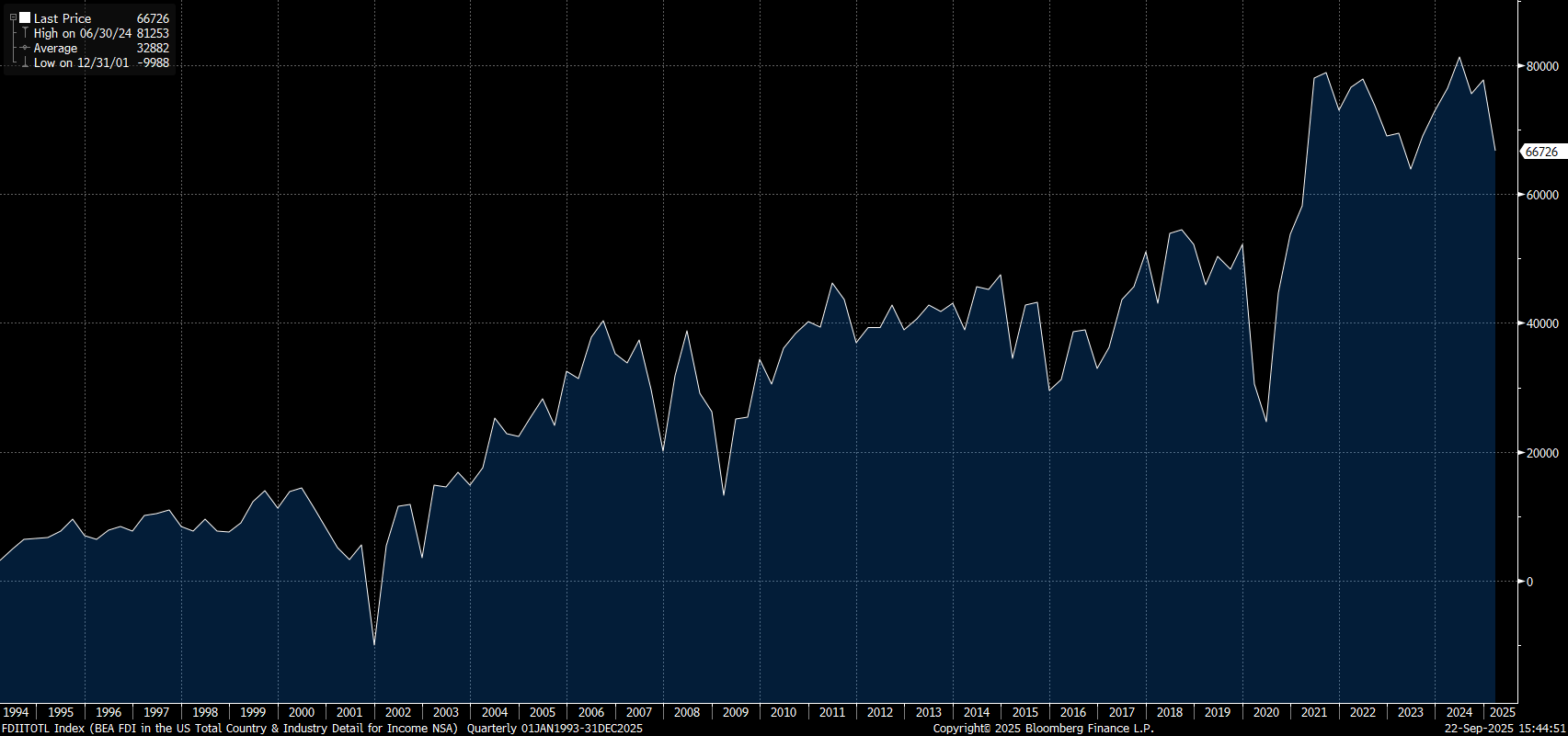 As foreigners get more dollars, they recycle those dollars back into US assets: (chart below is foreign direct investment)