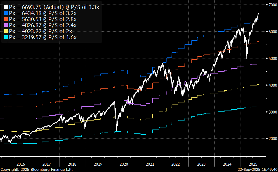 All of these functions in an almost magical way because we have a utopian-like financial market fueled by positive growth, procyclical fiscal spending, and Fed rate cuts—even as inflation risk outweighs recession risk. This is WHY the S&P500 is at a historic valuation on a price to sale basis.