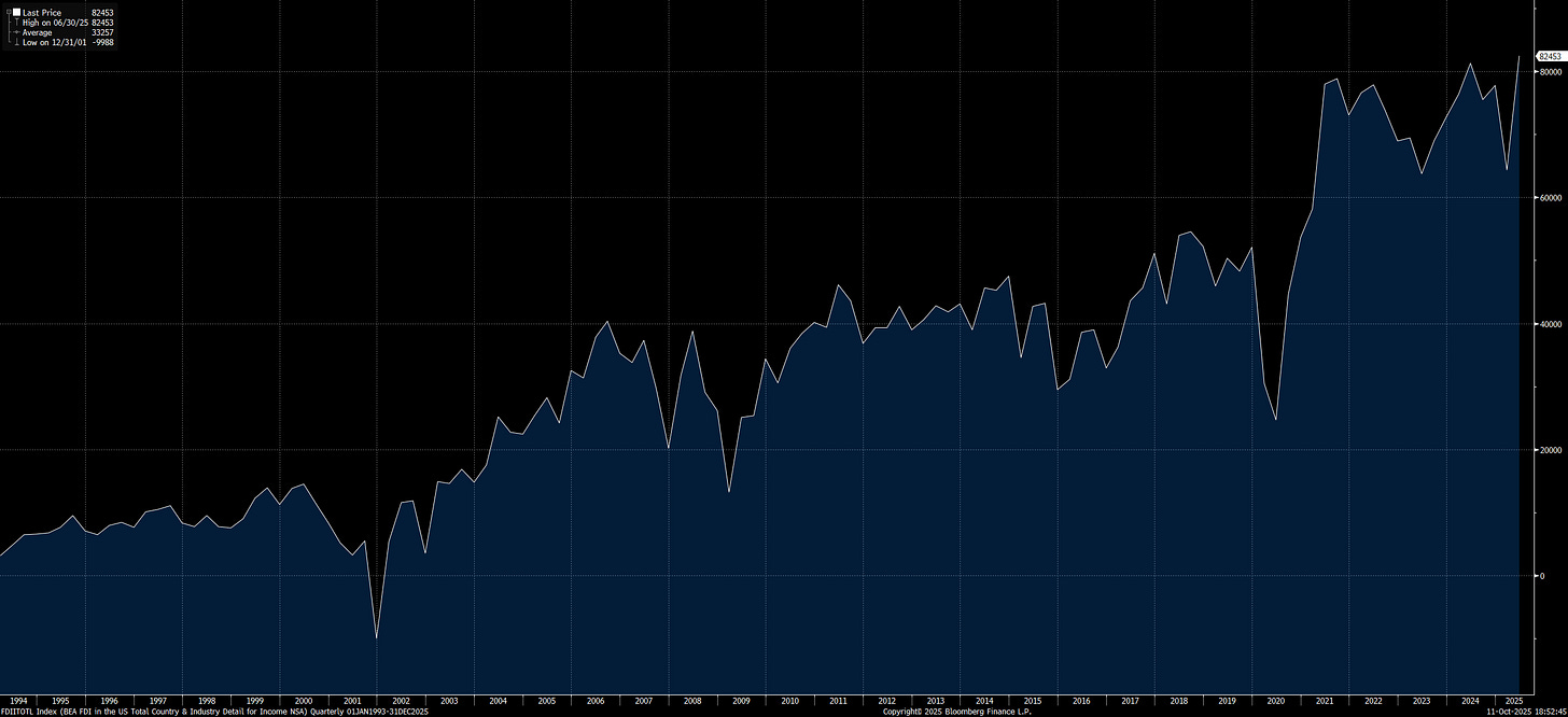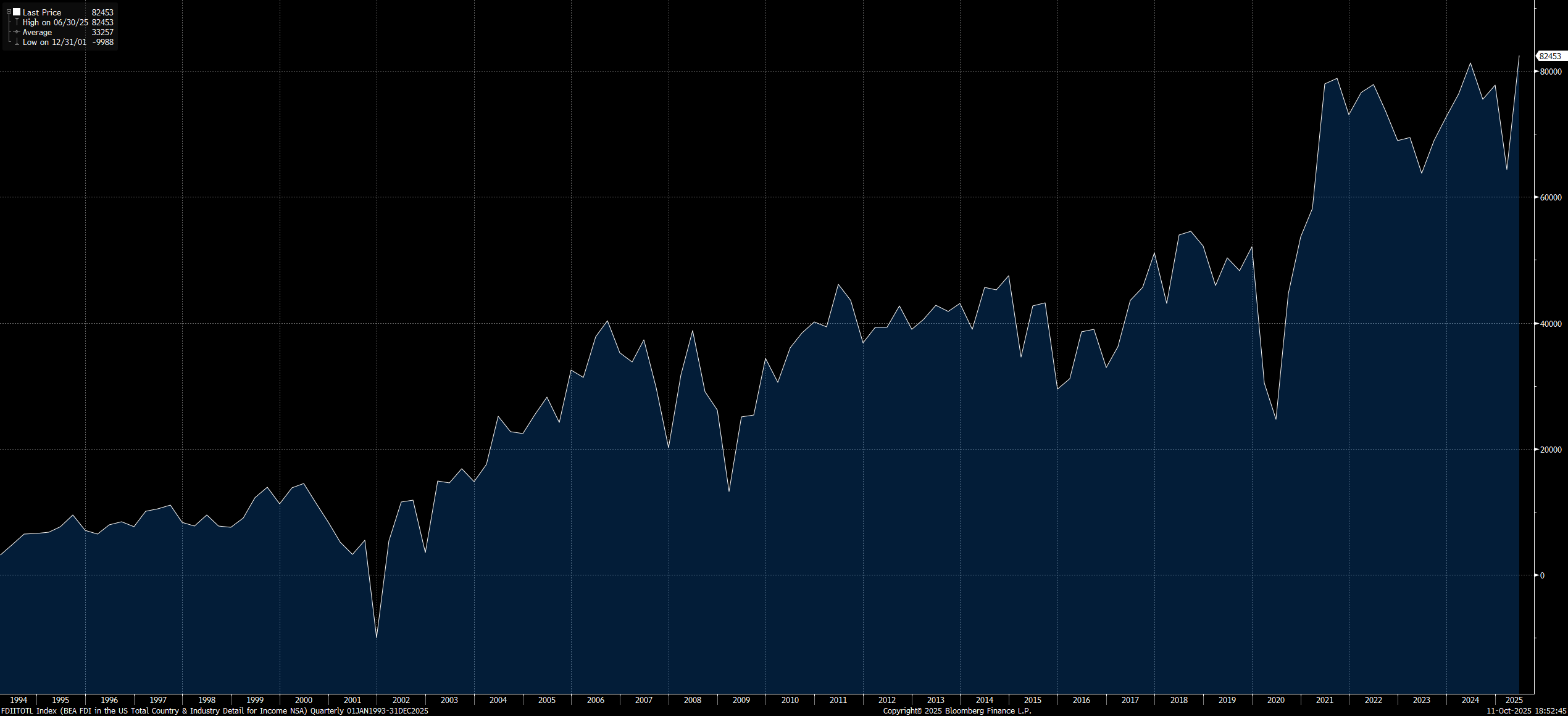This collective obsession is distracting from the most significant risk in the global system: cross-border flows. Tariffs are tied not only to trade relationships and geopolitics, but also to HOW MUCH capital foreign investors can allocate to US equities. This core misunderstanding explains WHY tariff headlines trigger equity selloffs and HOW they reshape global liquidity flows. (Chart below shows foreign direct investment into the United States)