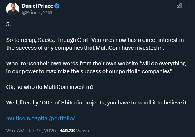 The appointment of David Sacks as a leading figure in crypto policy provides a case study in how elite incentives shape markets. As noted in this Twitter thread, Sacks’ alignment with crypto funds creates inherent conflicts of interest.